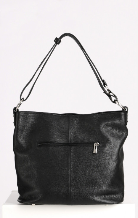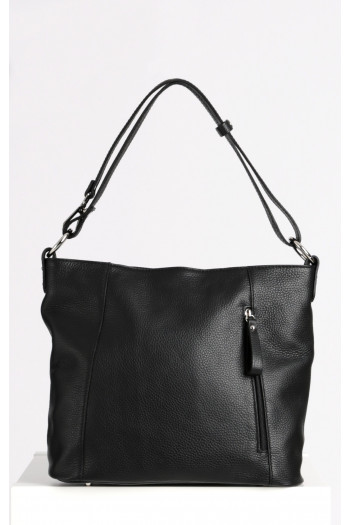 Geantă din piele naturală cu un capac moale care se închide cu nasture magnetic. Modelul are două compartimente individuale cu un buzunar mic cu fermoar și unul care este potrivit pentru depozitarea telefonului. Geanta are o bretea mai scurtă cu elemente metalice aurii, de asemenea se poate purta cu o bretea lungă reglabilă. Confecționată în Italia, la comandă lui Daphne. Dimensiuni: 27/23/9