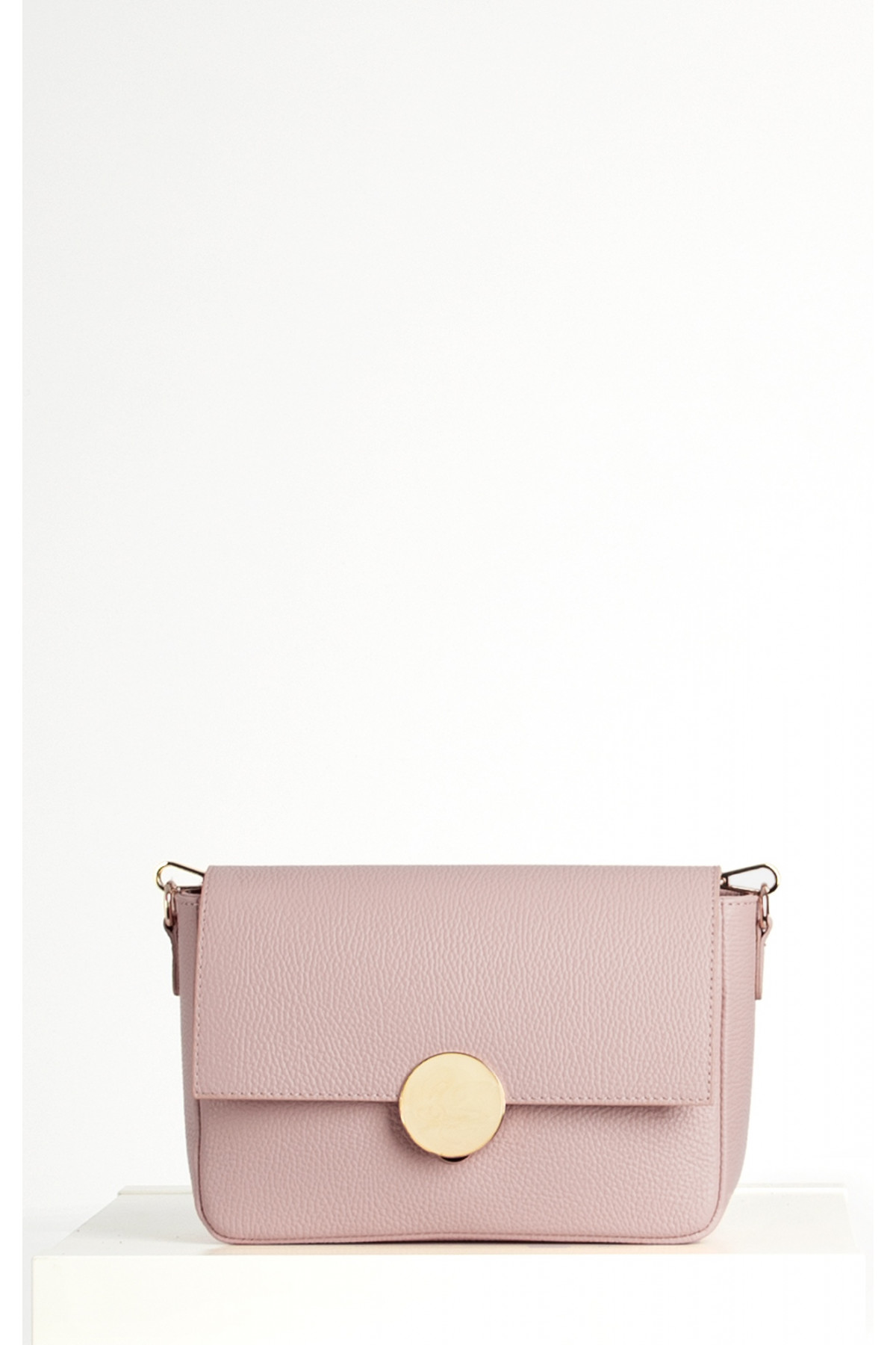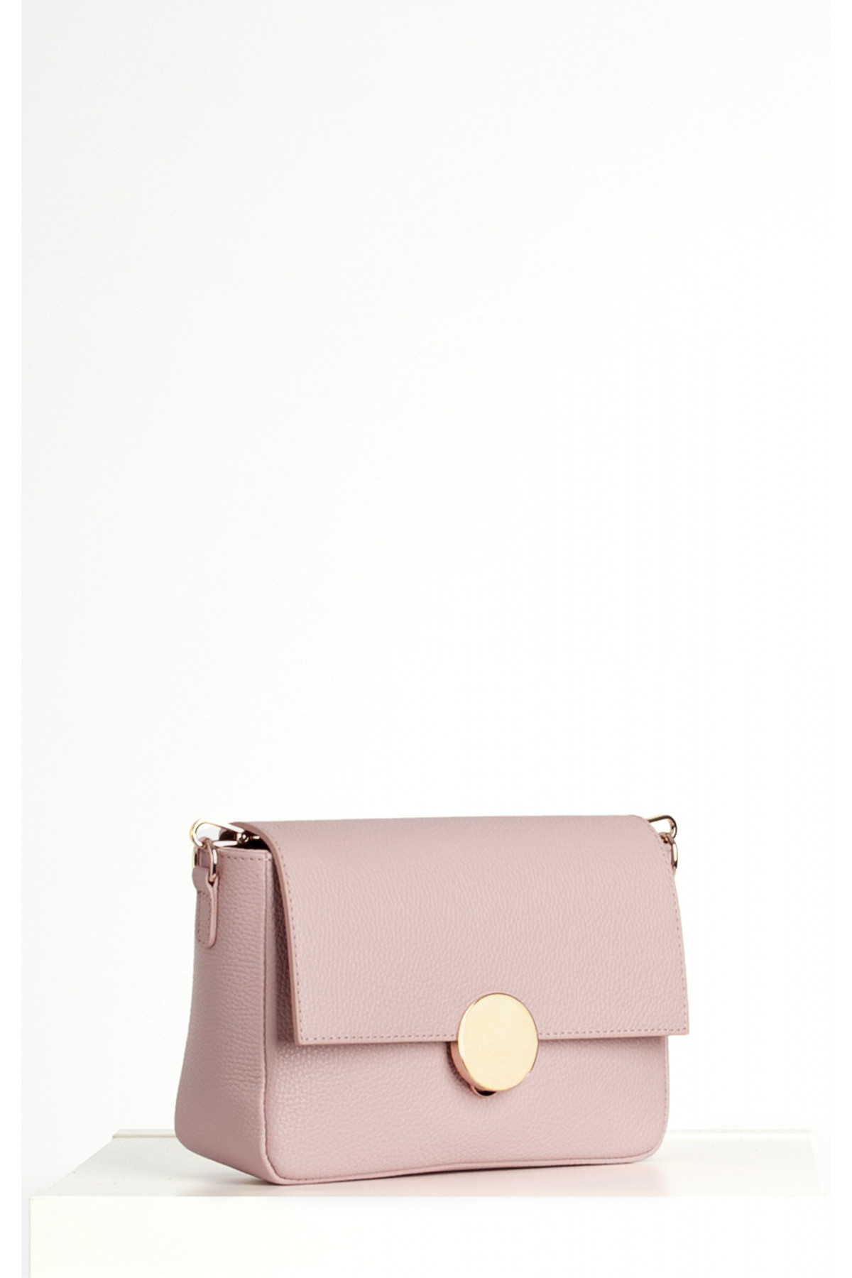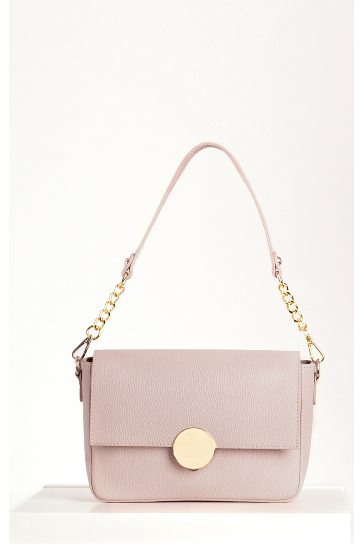 Geantă din piele naturală, de culoare Rose Smoke. Modelul are un compartiment comun cu un buzunar mic cu fermoar. Geanta are o bretea mai scurtă cu elemente metalice aurii, cu posibilitatea de a fi purtată cu o bretea lungă reglabilă. Confecționată în Italia la comanda lui Daphne. Dimensiuni: lungime: 28cm. Înălțime: 18cm. Adâncime: 8cm