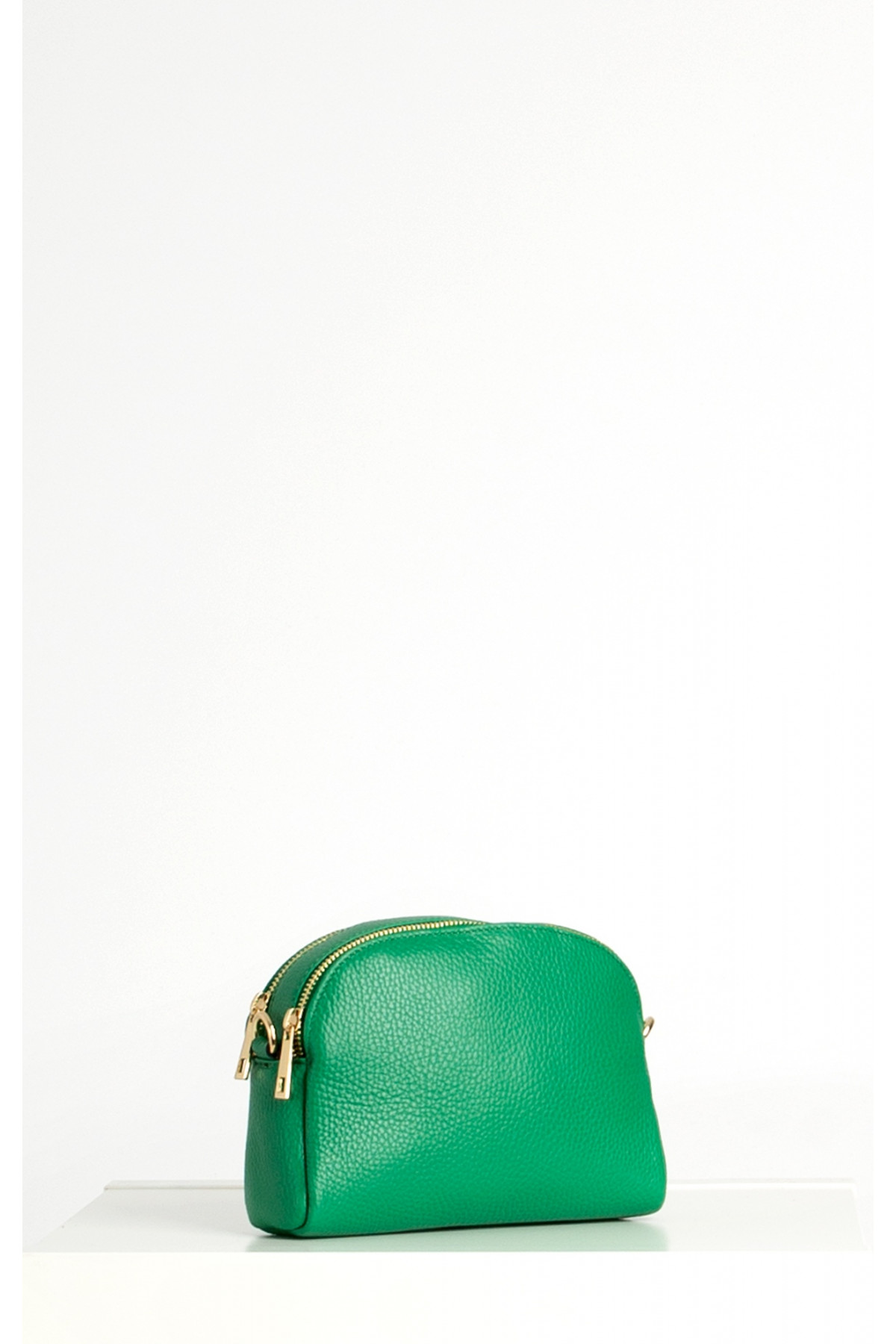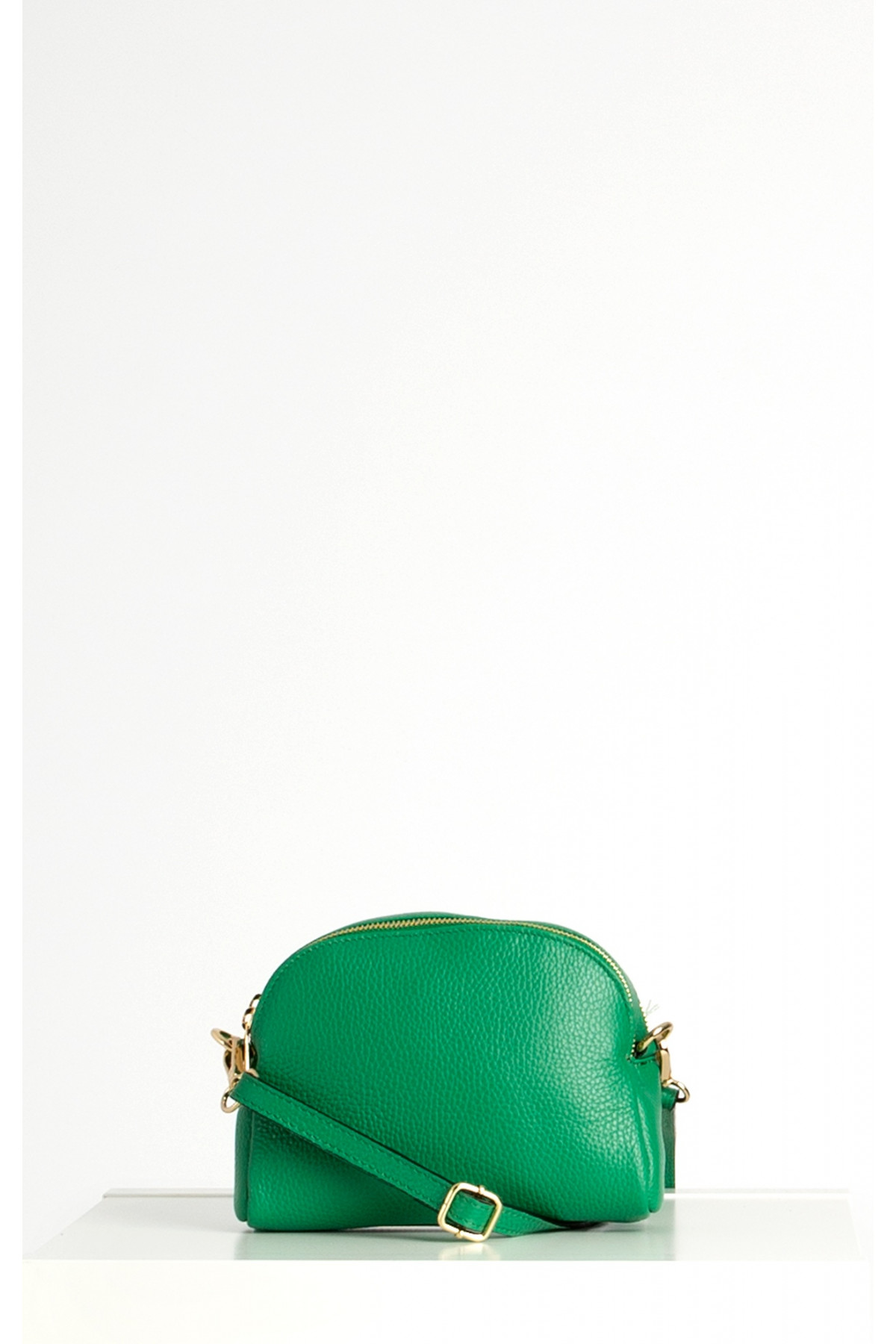 Geantă din piele naturală cu curea extensibiluă.Cu două compartimente. Unul din iei cu buzunar interior suplimentar. Geantă este în culoarea verde cu două fermoare metalice aurii.Fabricată în Italia la comanda Daphne. Dimensiuni: lungime:21cm, înălțime:15cm,adâncime:5cm