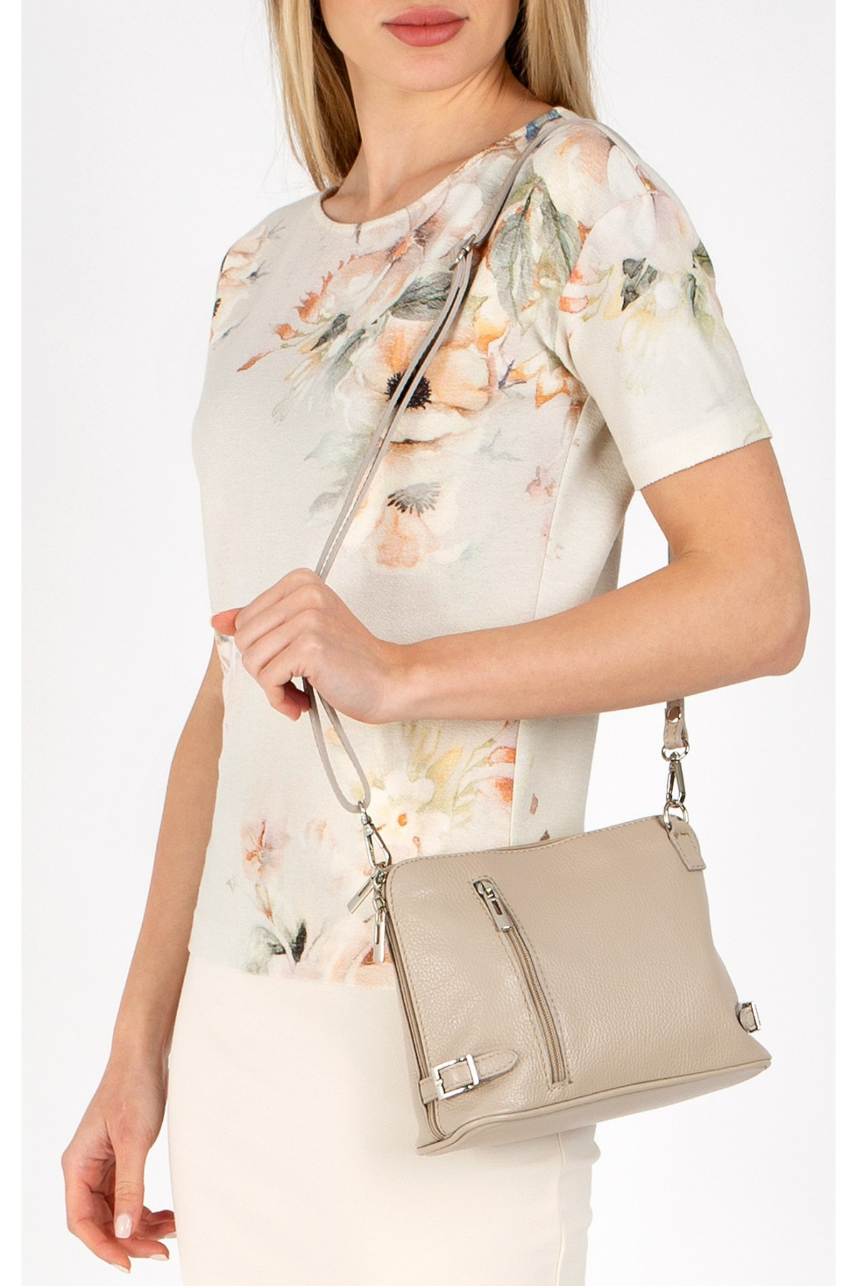 Geantă mică cu un design deosebit din piele naturală, de culoare Sesame, confecționată în Italia, la comandă lui Daphne. Geanta are un compartiment comun care este împărțit în două de un buzunar mijlociu cu fermoar, suplimentar, are și un buzunar interior potrivit pentru accesorii și telefon. Pentru o funcționalitate mai mare, există și două buzunare exterioare pe față și spate. Aceasta se poate purta pe umăr cu o bretea lungă reglabilă. Dimensiunile genții: 25/19/9 cm.