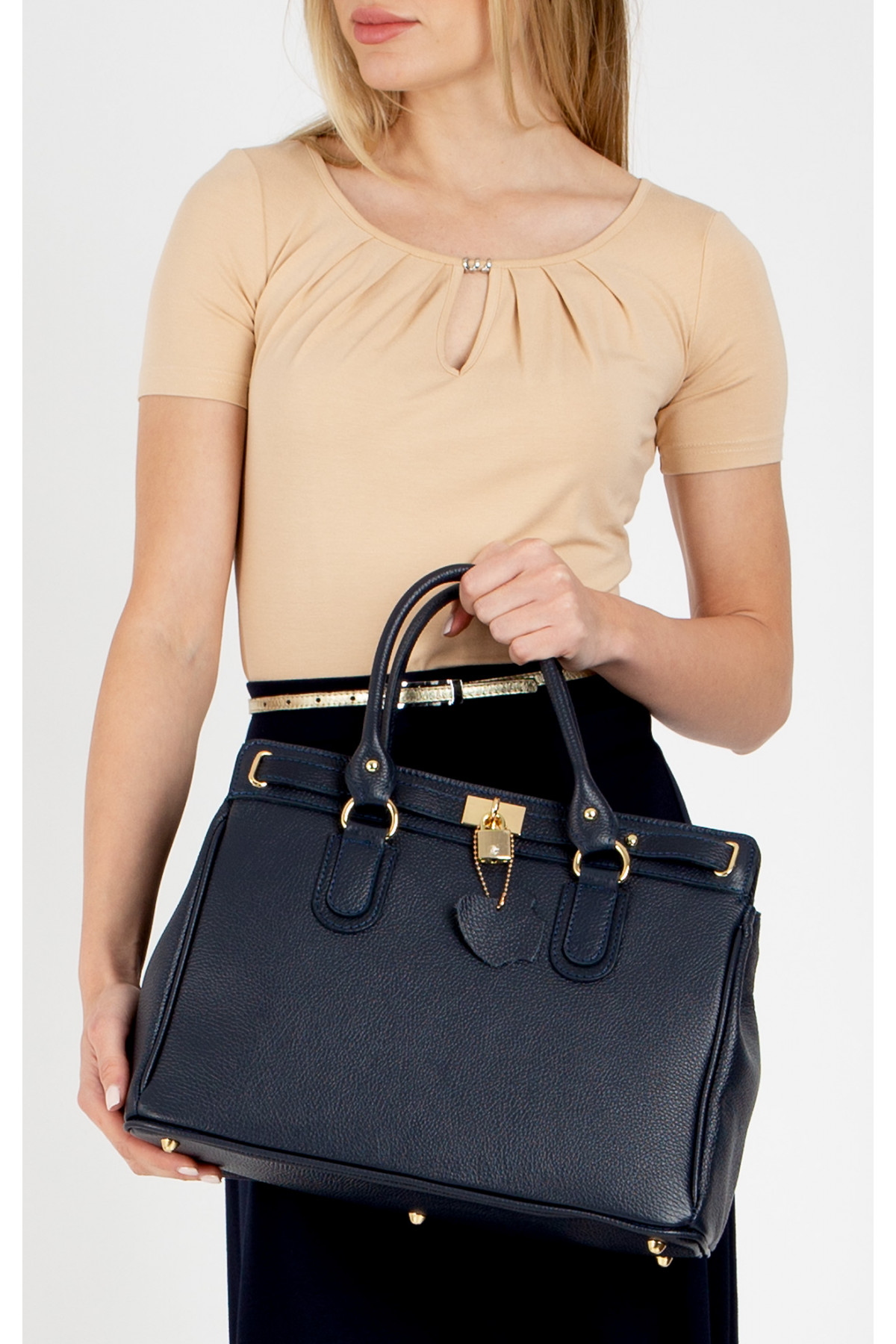 Geantă mare pentru damă, cu un design elegant, confecționată dintr-o piele naturală de înaltă calitate, de culoare albastru închis. Modelul genții  are o formă structurată, rigidă și un aspect simplu, subliniat cu o cataramă decorativă aurie cu lacăt. Această geantă este aranjat practic în trei compartimente separate, cel mijlociu se închide cu fermoar pentru mai multă siguranță. În unul dintre compartimentele laterale există un buzunar mic interior cu fermoar, iar în celălalt – două compartimente potrivite pentru telefon sau accesorii mici. Geantă are două mânere scurte pentru purtare în mână, de asemenea, un fund solid cu picioare metalice, care protejează pielea de murdărie și uzură. Această geantă se poate purta pe umăr cu o bretea lungă reglabilă. Ideală pentru un aspect business, ocazii formale sau ținute elegante casual. Aceasta este confecționată în Italia, la comandă pentru Daphne.
