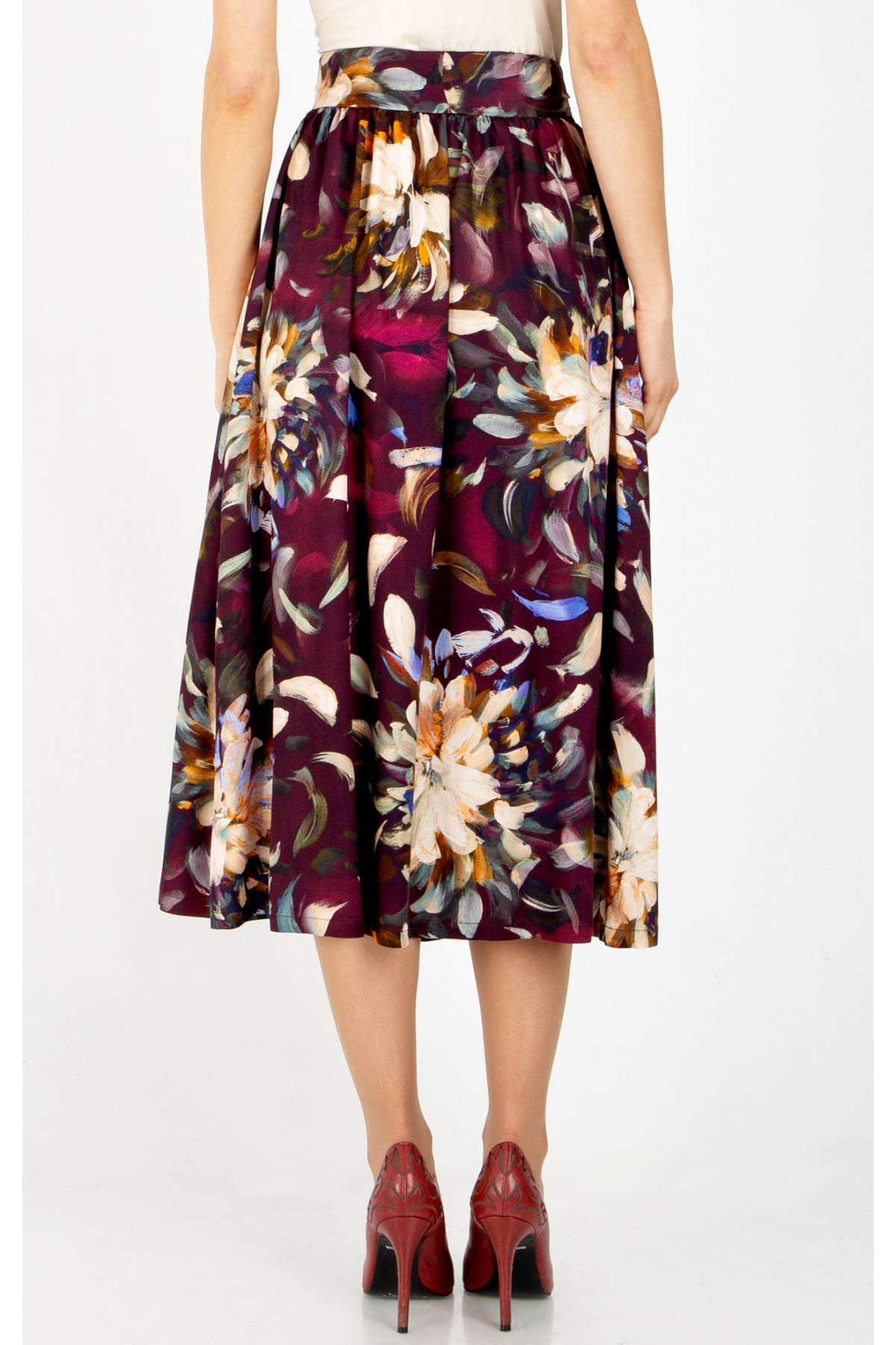 Midi fustă din vâscoză luxoasă, în culoarea Grape Wine, cu un print floral pictural