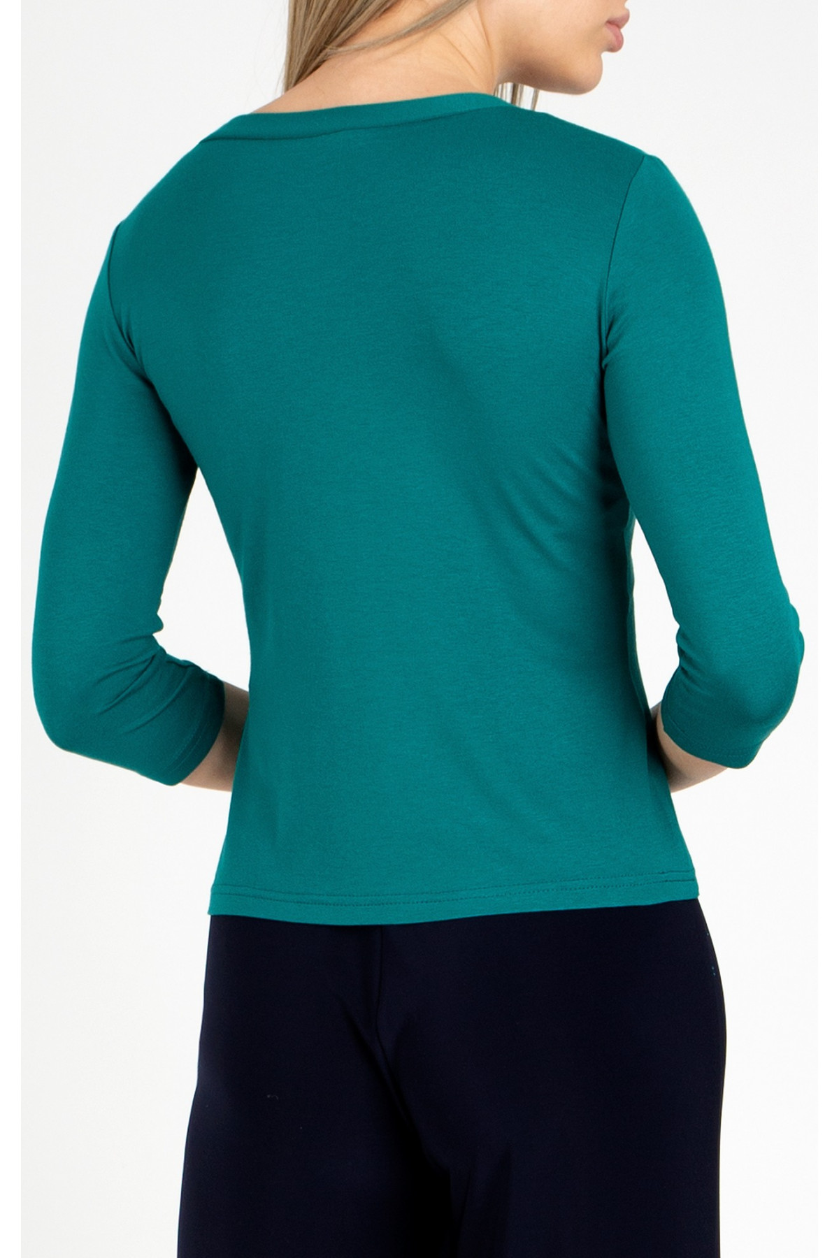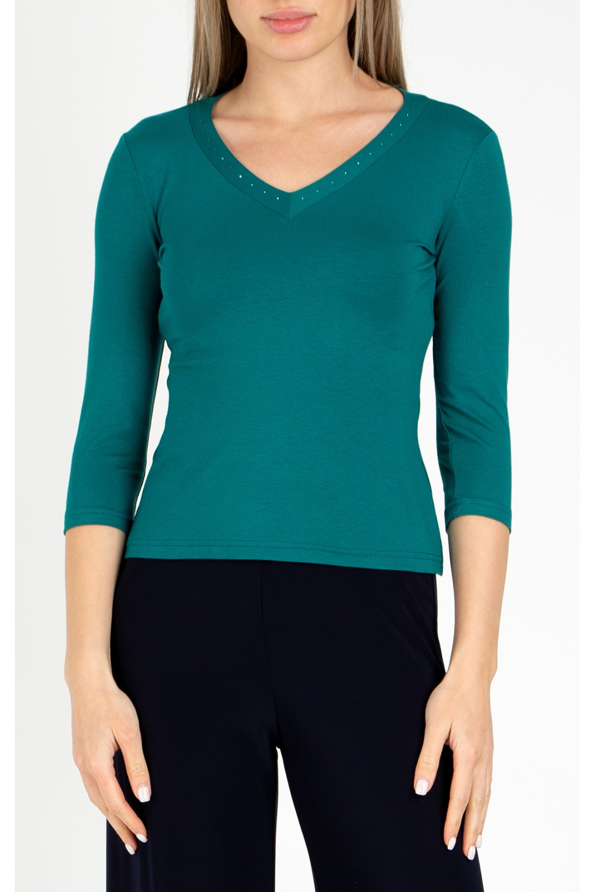 Bluză elegantă decorată cu cristale Swarovski pe linia decolteului, în culoare Teal Green. Modelul bluzei este confecționat dintr-un tricot moale și elastic, cu decolteu în formă de V subliniat cu o bordură decorată cu cristale strălucitoare Swarovski și mâneci 3/4. O alegere excelentă pentru femeile care apreciază confortul în ținutele de zi sau de birou. Asortați ușor cu fuste sau pantaloni. Disponibilă în mărimile de la 36 la 46.