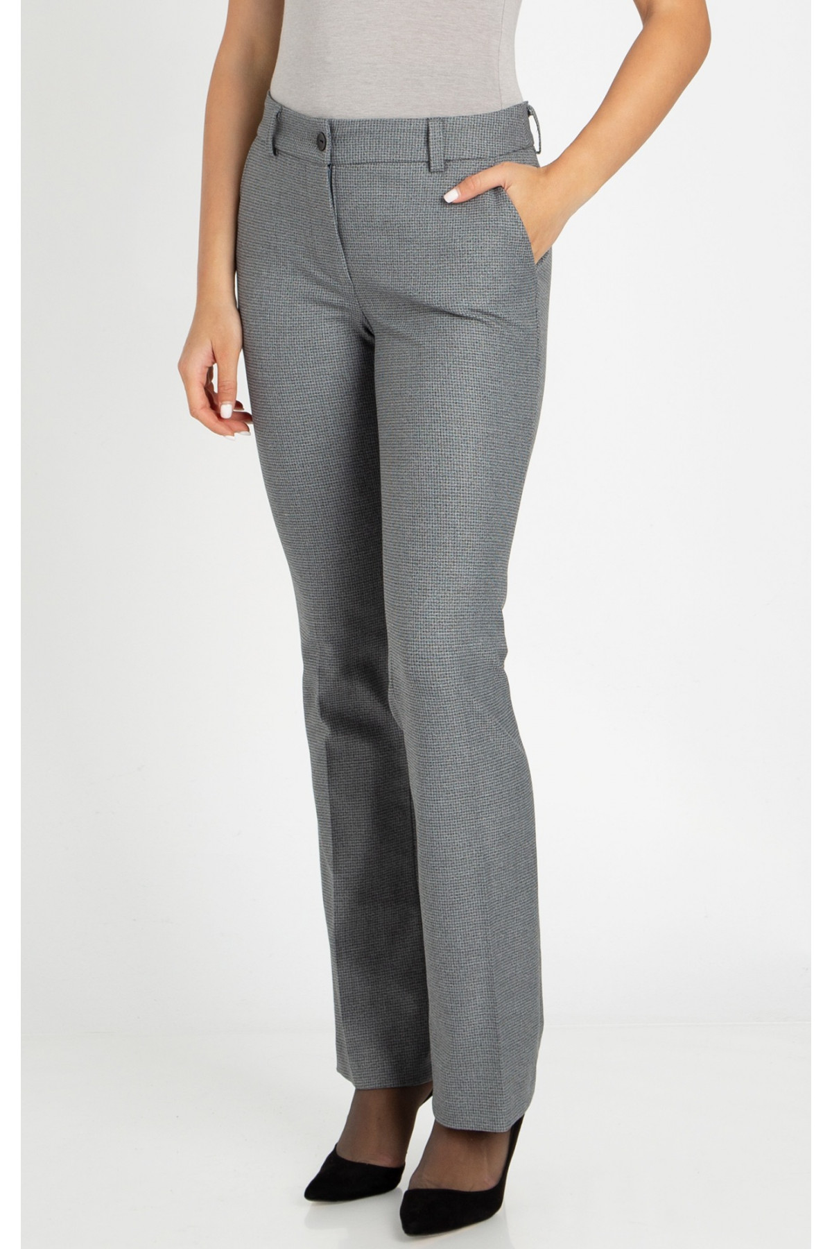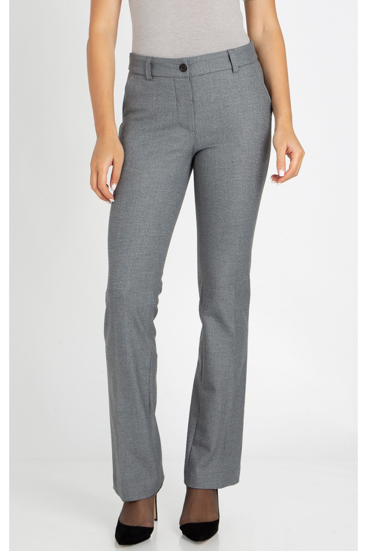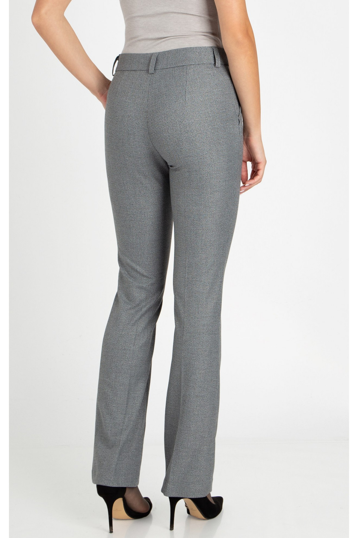 Pantaloni clasici, confecționați dintr-un material elastic de lux, în elegant imprimeu pepita în nuanțe de gri, cu croială precisă și confort incomparabil.