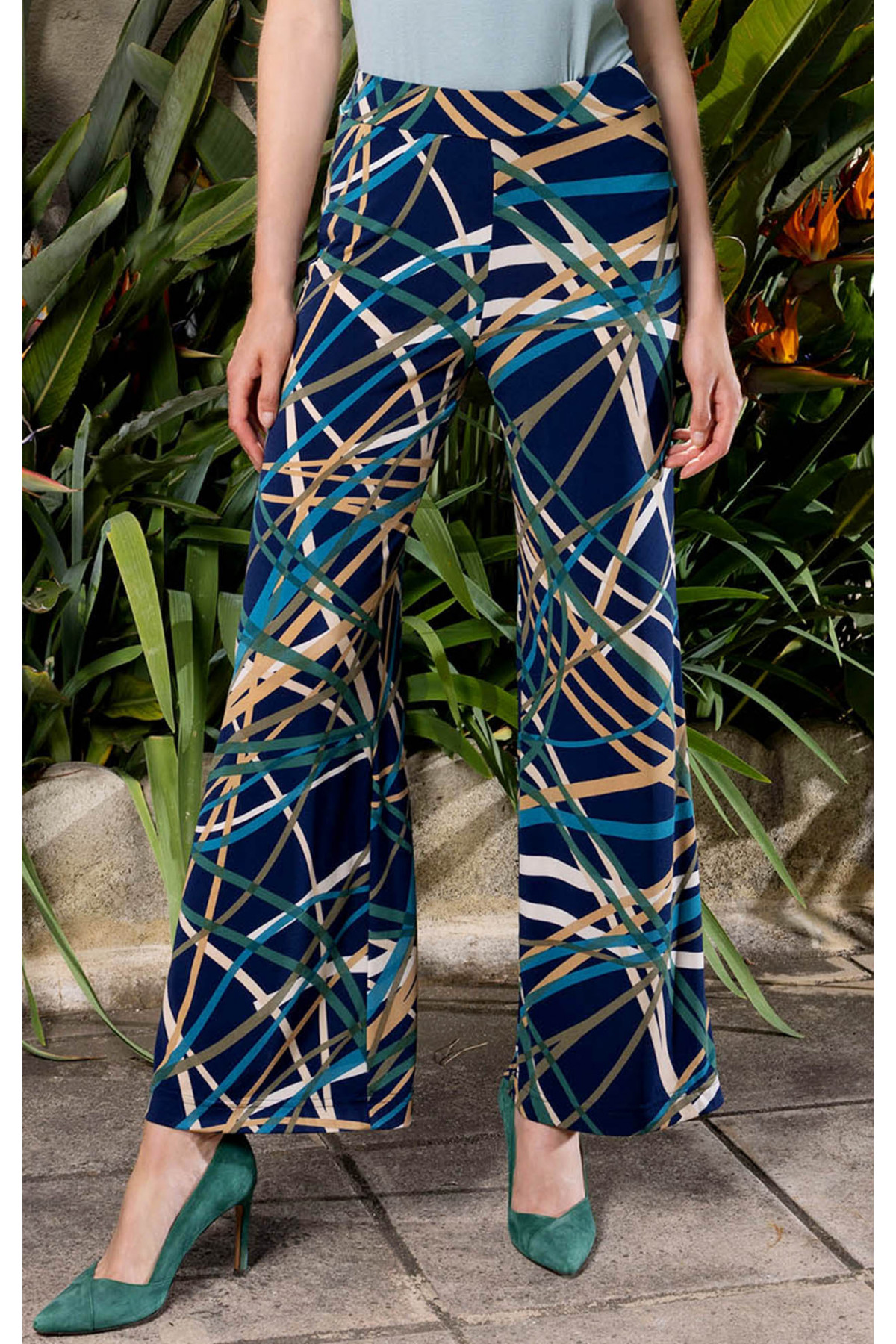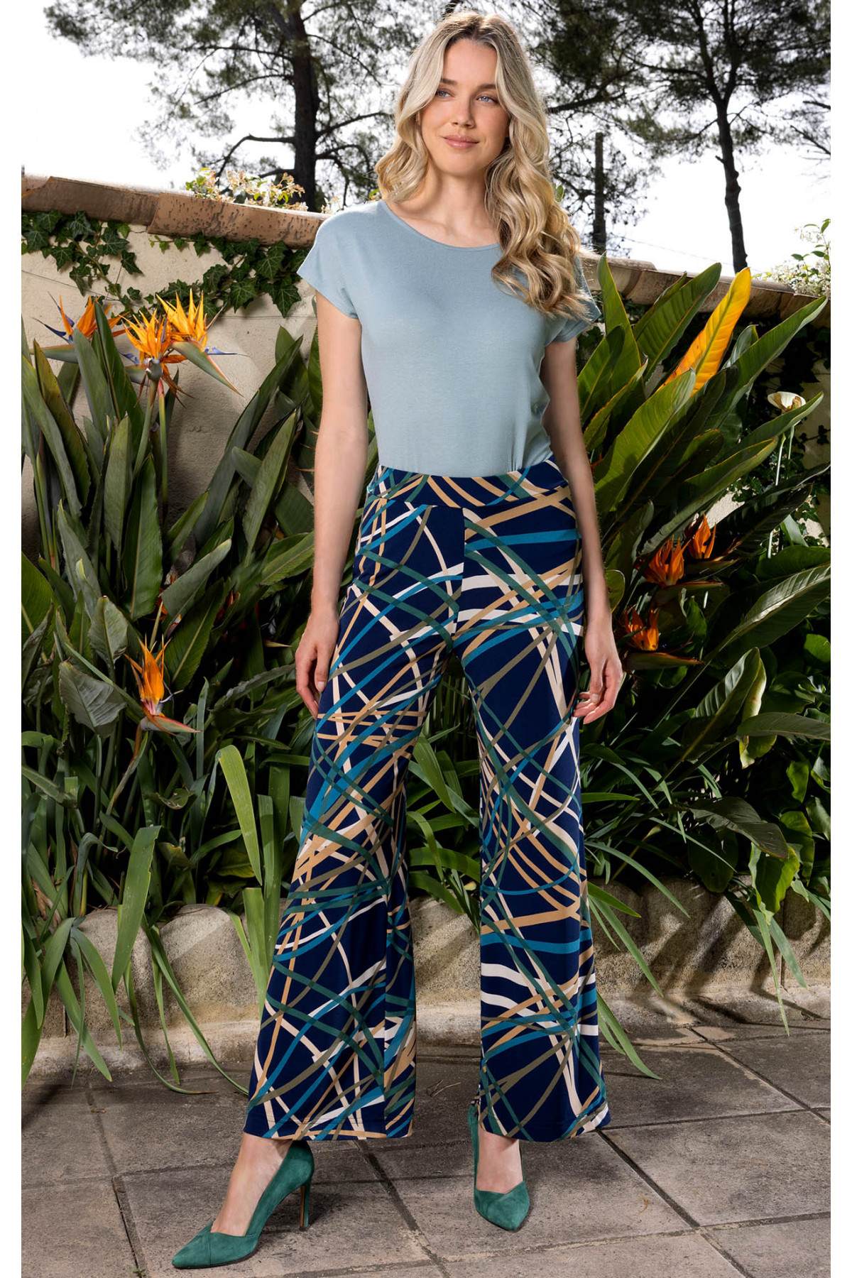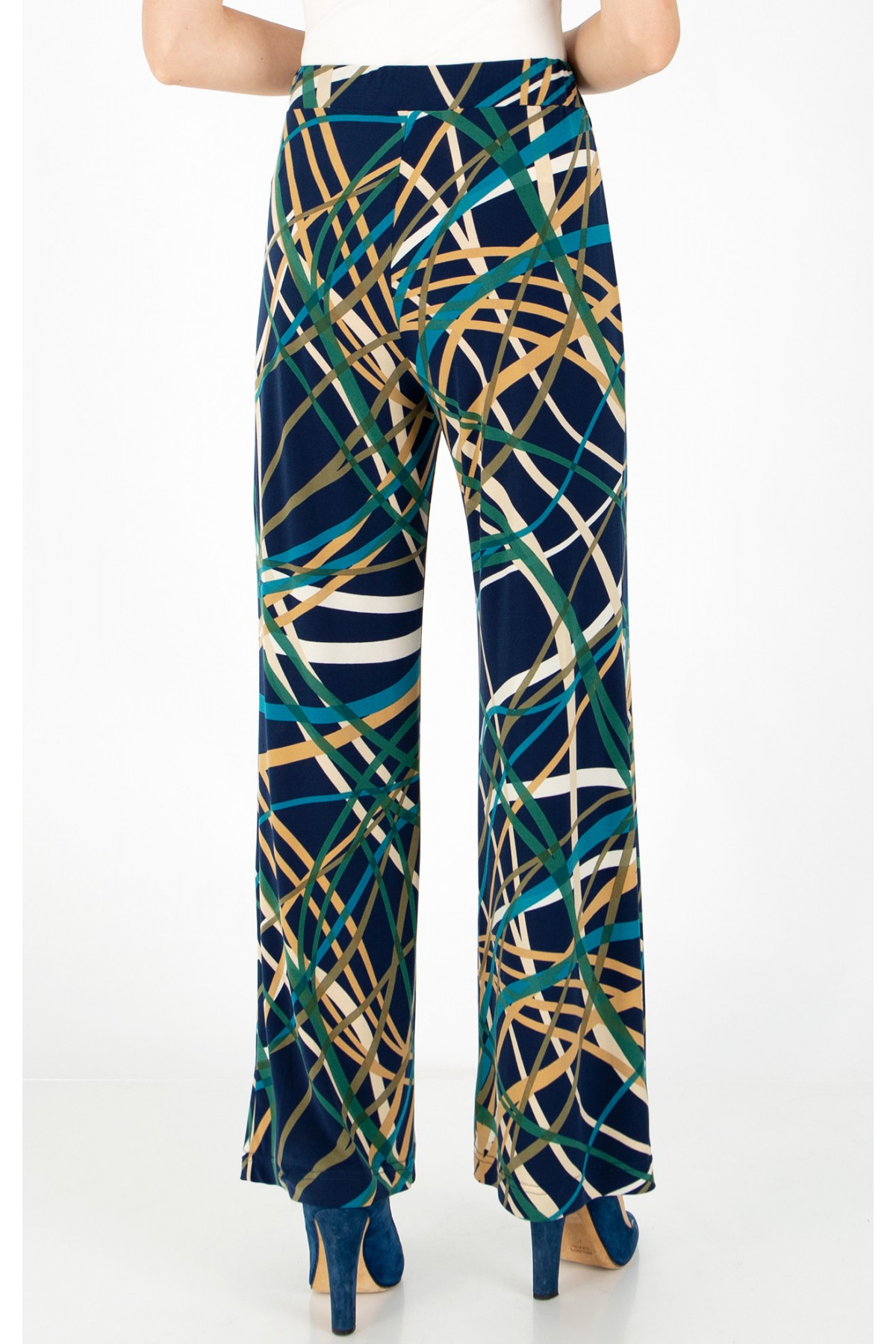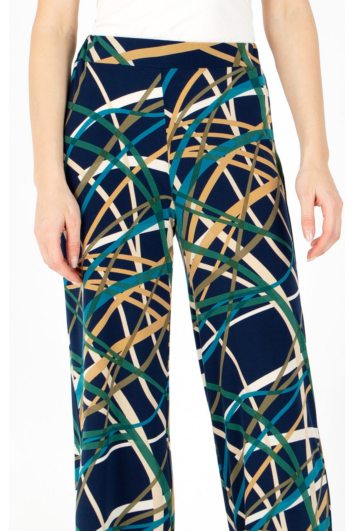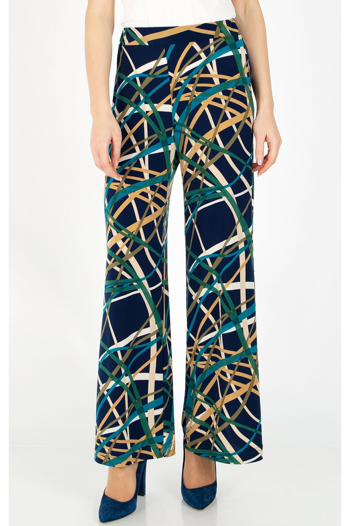 Pantaloni din jerseu ușor cu siluetă lejeră de culoare de culoare albastru închis și cu imprimeu grafic. Modelul pantalonilor are crac larg și elastic în talie, confecționat dintr-un material de tricot ușor tip jerseu cu imprimeu grafic. Pantaloni comozi și ușori pentru purtare în timpul lunilor calde. Pantalonii sunt disponibili în mărimile de la S până la 3XL.