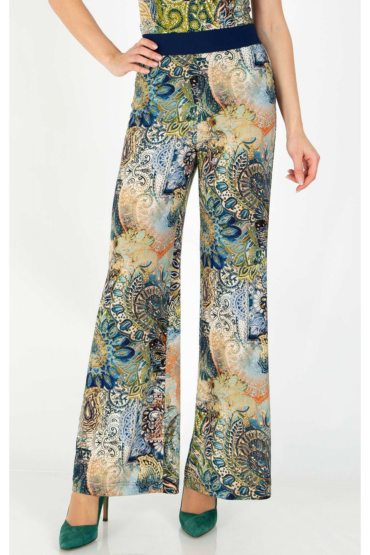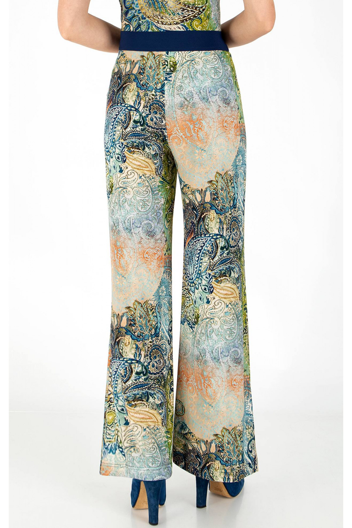 Pantaloni din jerseu ușor cu siluetă lejeră și cu modele paisley în albastru, verde și portocaliu. Modelul are elastic larg în talie, confecționat dintr-un tricot ușor tip jerseu cu un imprimeu bogat cu motive paisley. Puteți combina cu bluză din aceeași țesătură și cu același imprimeu.