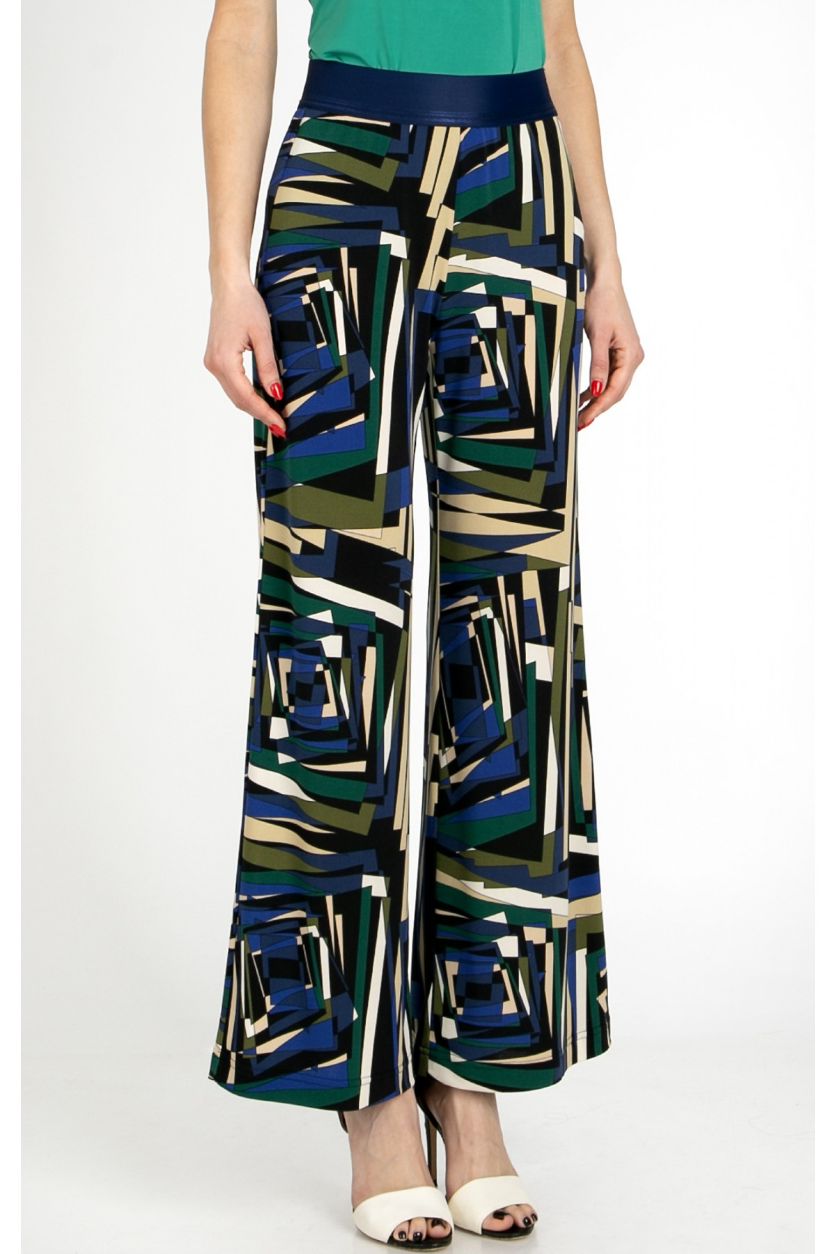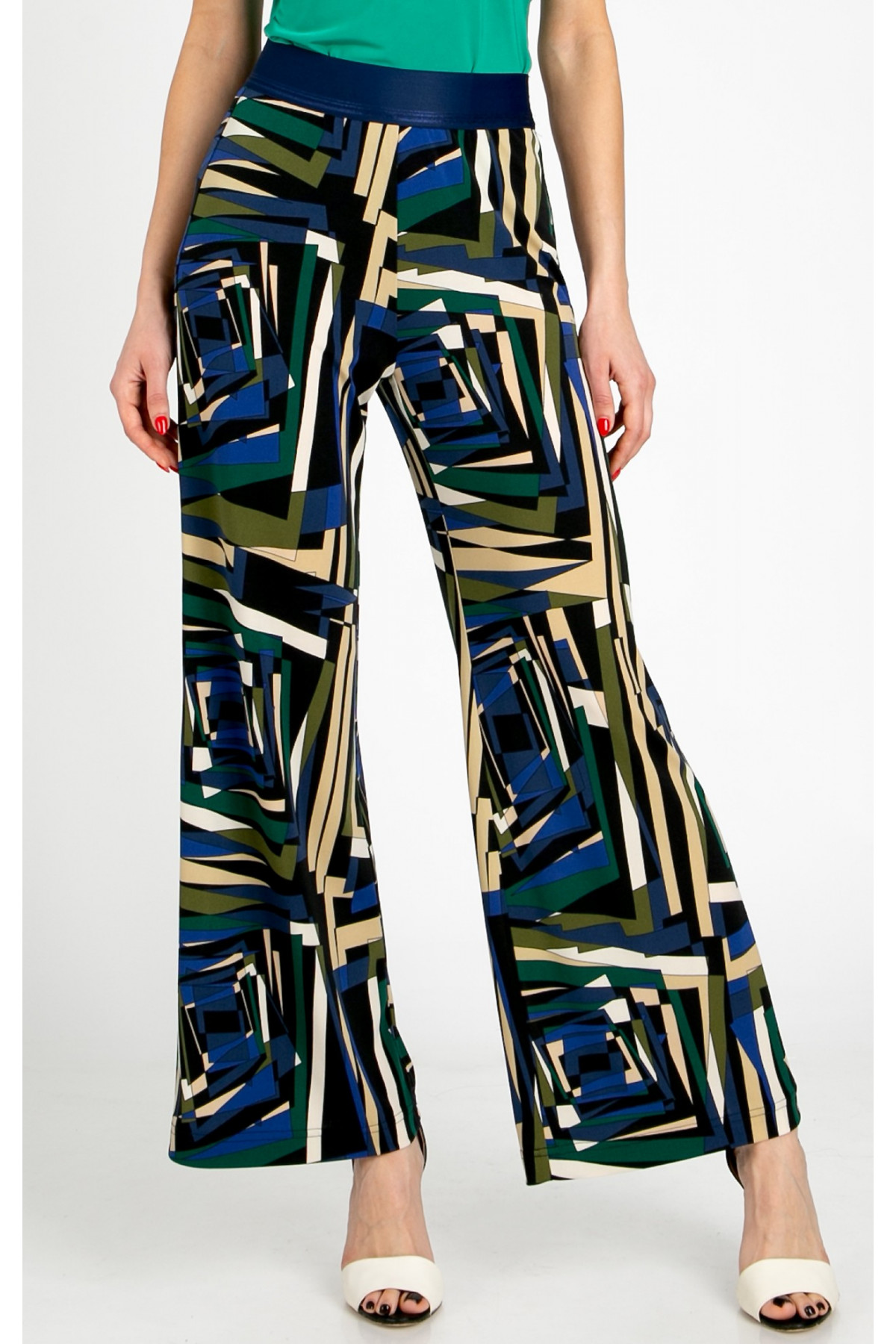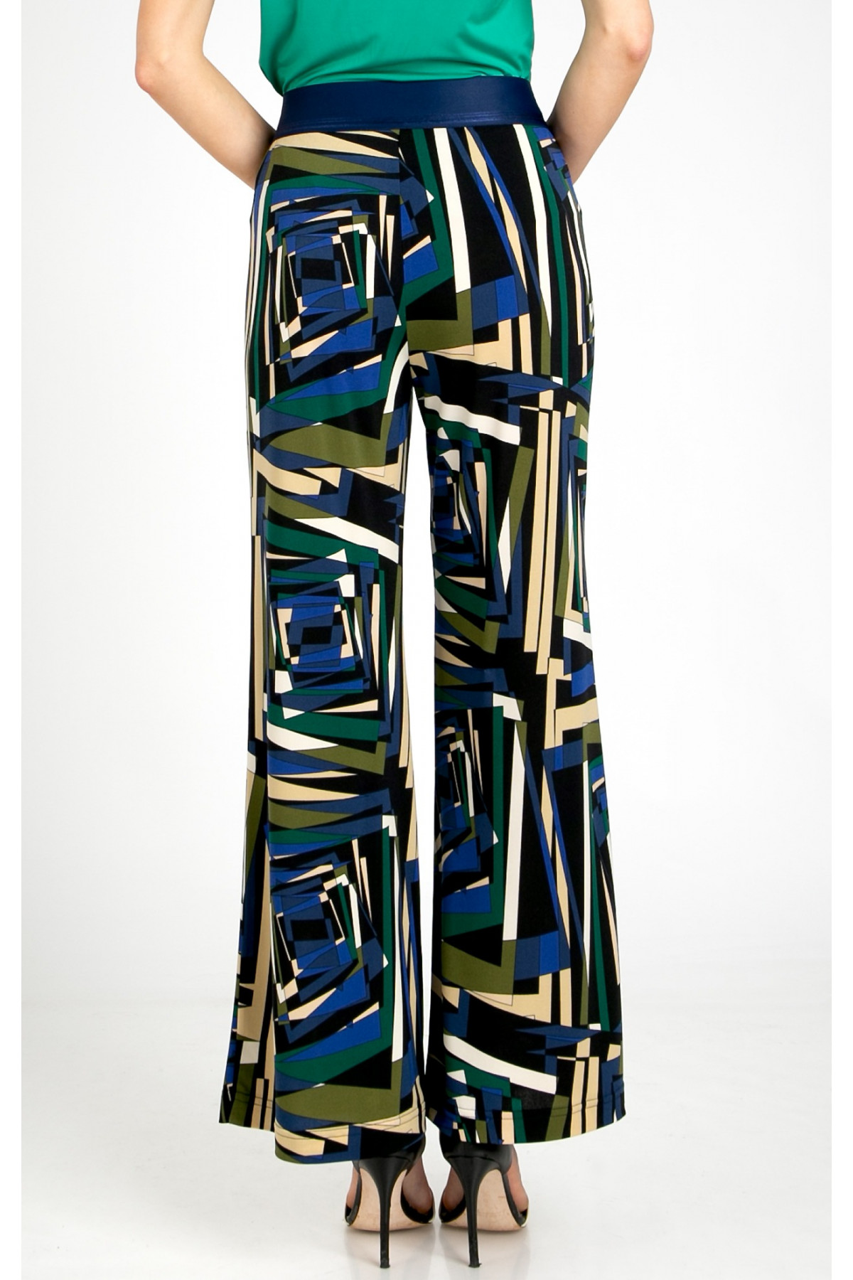 Pantaloni confecționați din jerseu tricotat cu imprimeu geometric abstract în nuanțe de Royal Blue, Green Olive și Ecru. Acest model cu siluetă lejeră este extrem de confortabil de purtat pe tot parcursul zilei – fie că este vorba de zile libere, de serviciu sau de călătorii. Croiala noastră precisă oferă o notă elegantă oricărei siluete, în timp ce linia evazată alungește vizual figura. Elasticul luxos din talie asigură un plus de confort. Pot fi combinați cu ușurință cu gama variată de bluze Daphne.