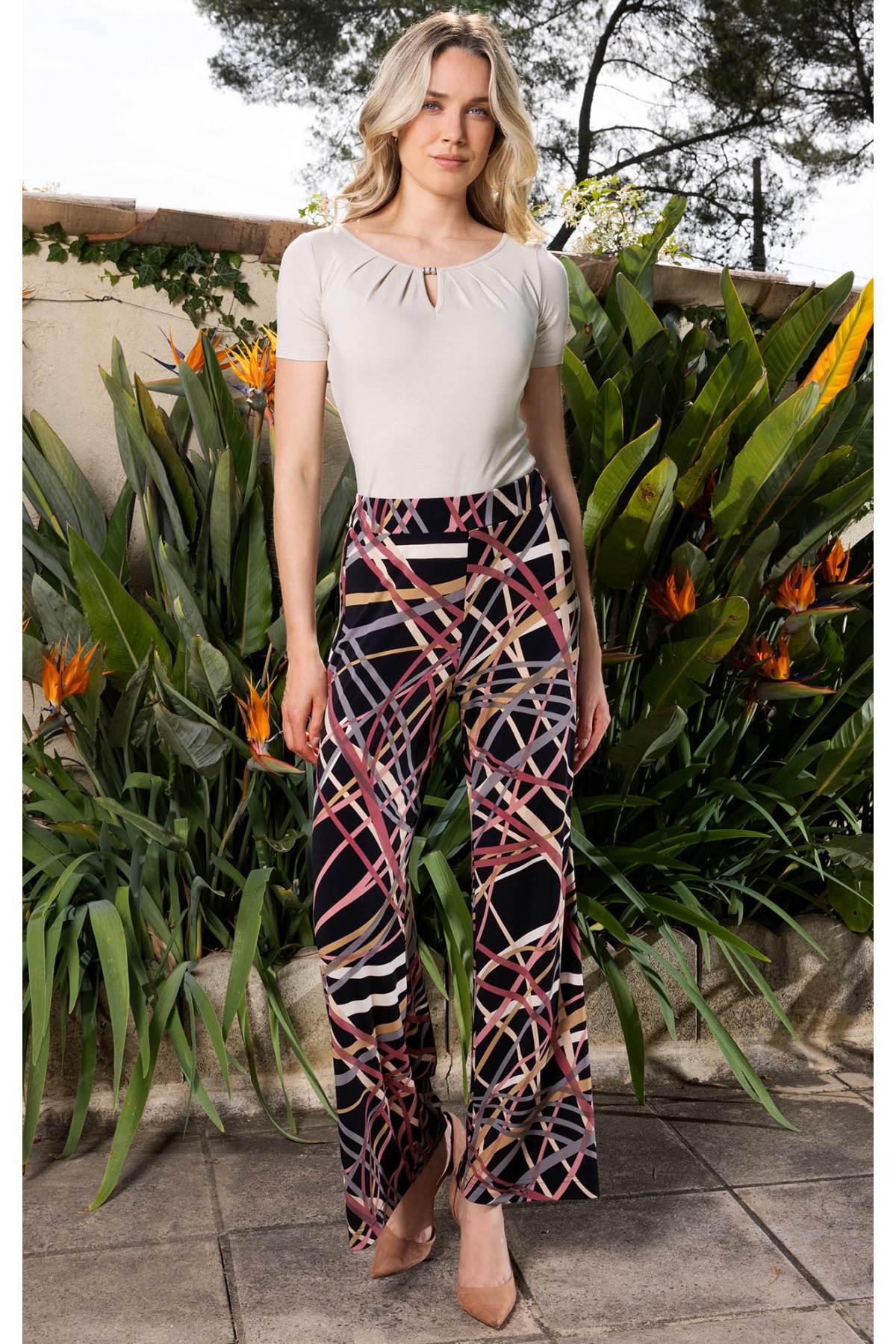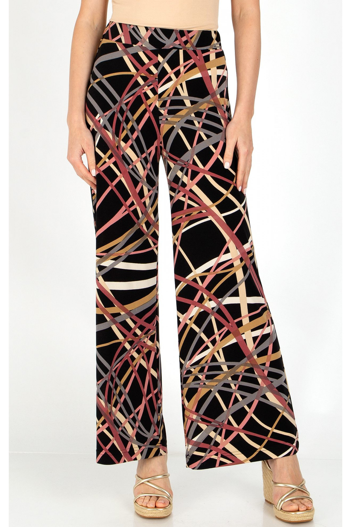 Pantaloni din tricot cu siluetă lejeră cu imprimeu grafic în culori pastelate calde. Modelul pantalonilor are craci largi și elastic în talie, confecționat dintr-un tricot tip jerseu cu imprimeu grafic dinamic. Pantalonii comozi și ușori pentru a fi purtați în timpul lunilor calde. Pantalonii sunt disponibili în mărimile de la S până la 3XL.