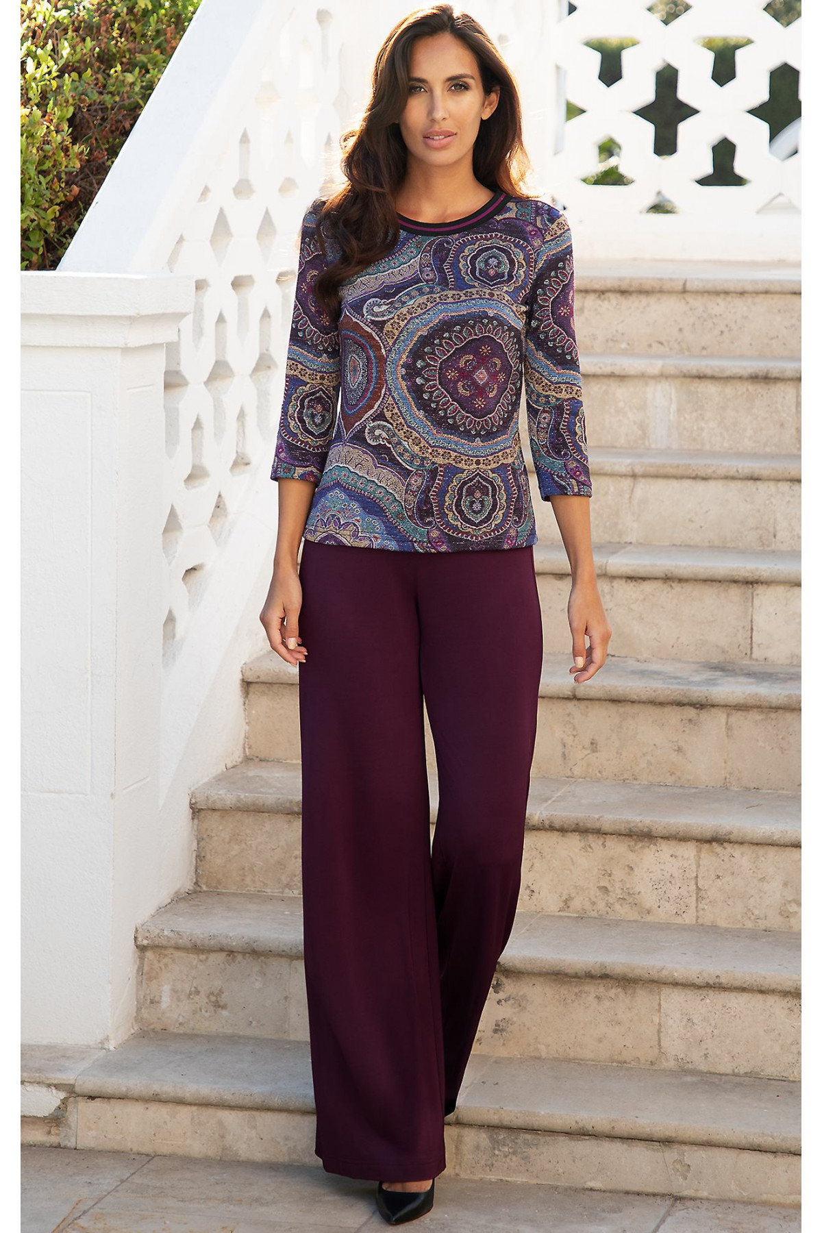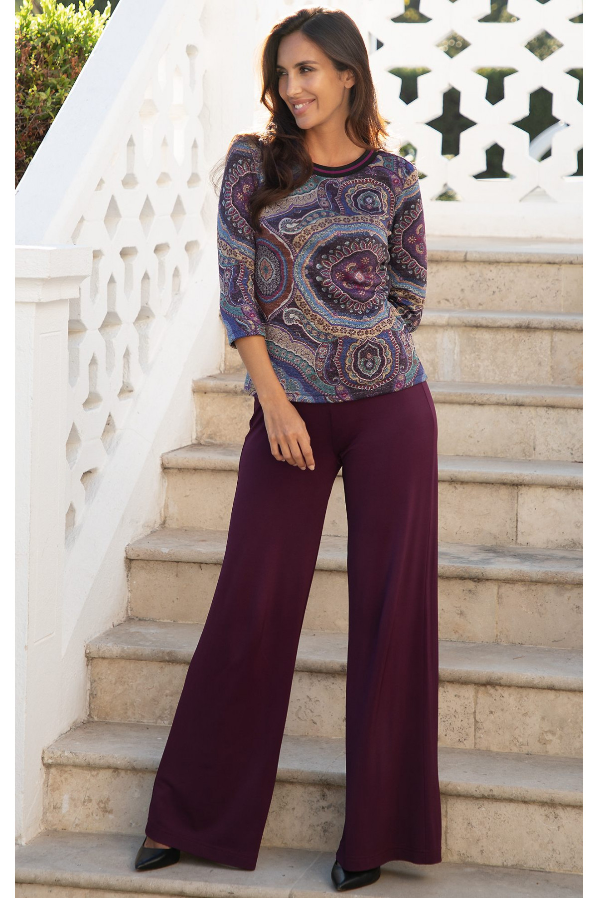 Pantaloni confecționați dintr-un tricot gros tip jersey, în culoarea Winter Bloom. Modelul cu croială lejeră este universal, ușor de combinat și extrem de confortabil pentru întreaga zi – potrivit atât pentru birou, călătorii, cât și pentru întâlniri de seară. Croiala precisă se așază elegant pe aproape orice tip de siluetă, iar linia ușor evazată alungește vizual figura, în timp ce elasticul din talie asigură confort suplimentar. Se poate combina cu ușurință cu gama variată de bluze Daphne.