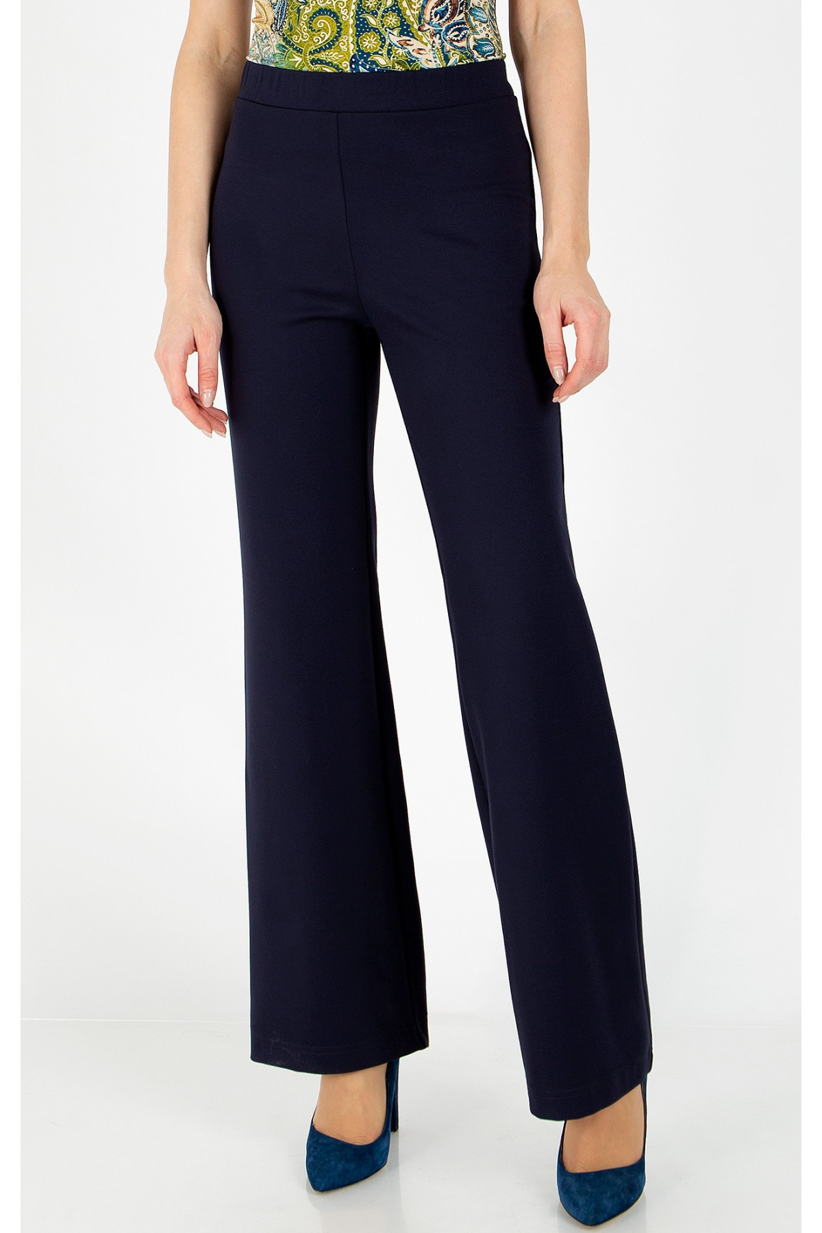 Pantaloni drepți dintr-un material de tricot ajustat de culoare albastru închis. Acest model are siluetă ușor lejeră cu un crac drept. Talia este completată cu un elastic larg pentru confort mai mare. Pantalonii sunt extrem de stilați, potriviți atât pentru viața de zi cu zi, cât și pentru birou. Se poate combina ușor cu bluză sau cămașă în funcție de aspectul dorit. Pantalonii sunt confecționați în mărimile de la S până la 3XL.