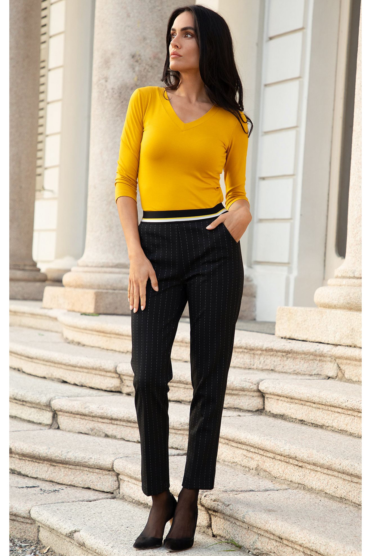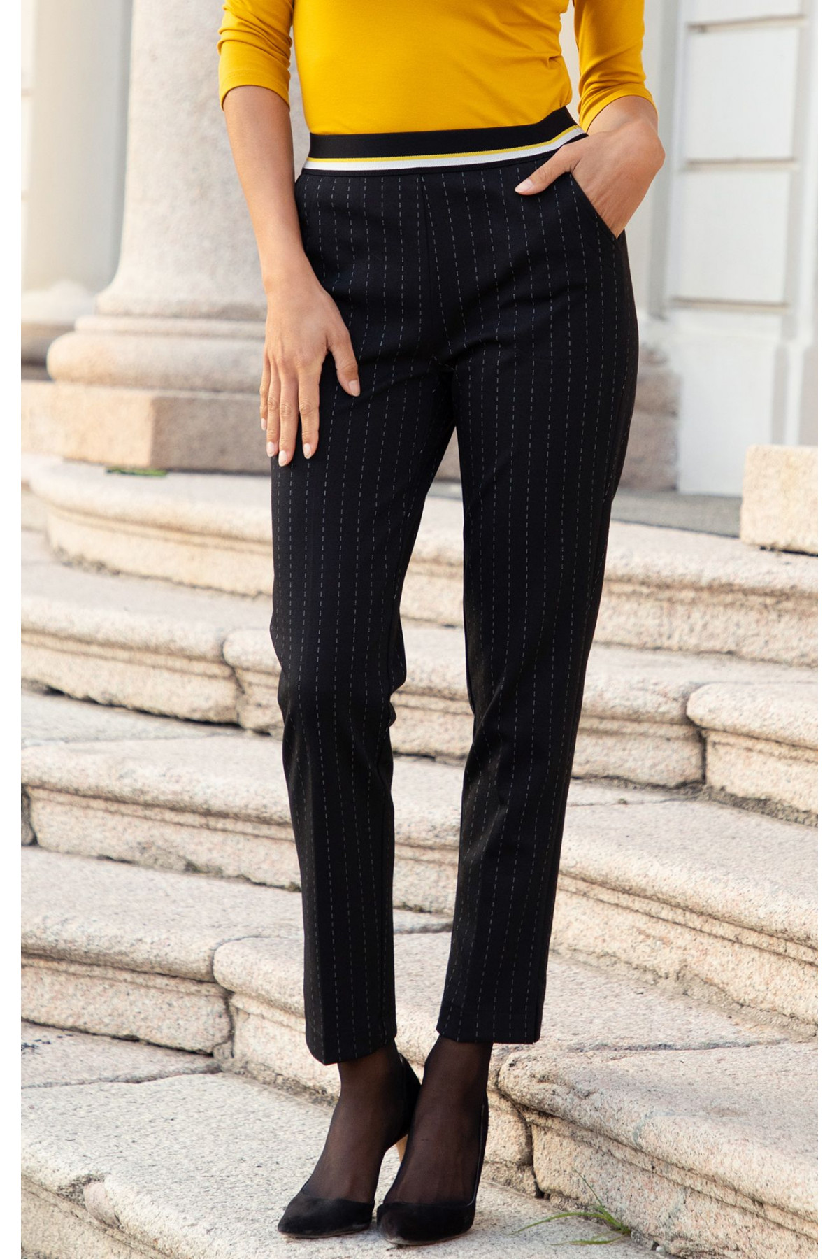 Pantaloni eleganți din material de tricot, de culoare neagră cu dungi albe