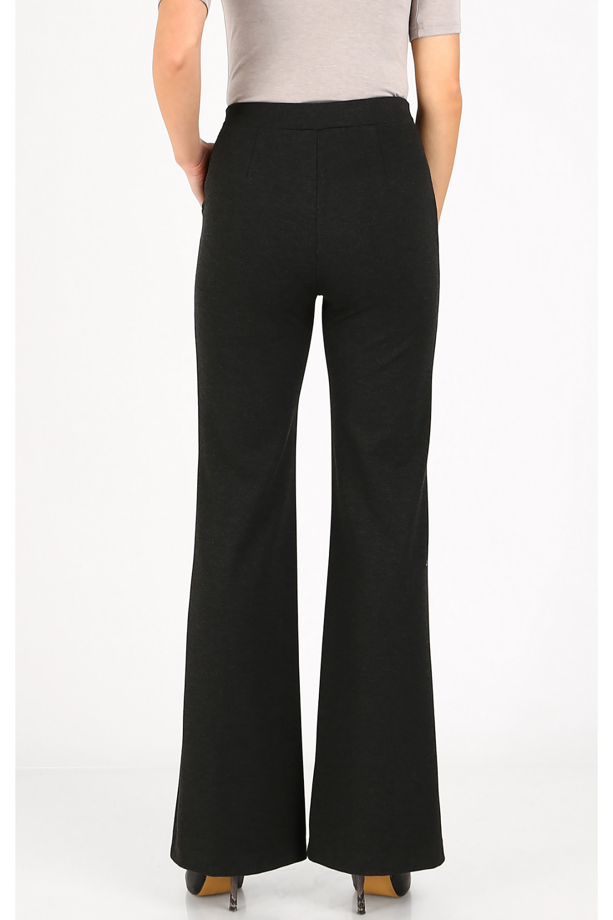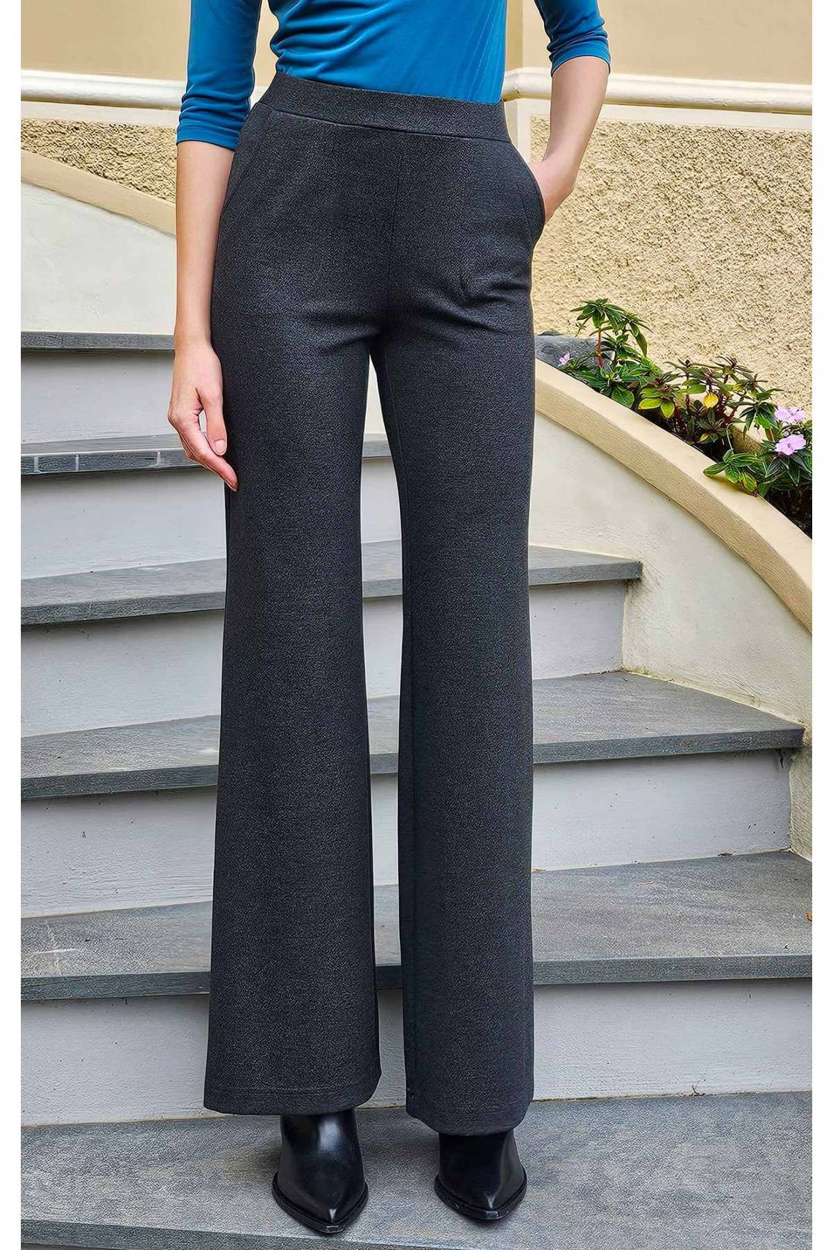 Pantaloni eleganți confecționați dintr-un tricot ferm în culoarea Graphite Melange. Modelul evidențiază linia șoldurilor și a coapselor, se lărgește ușor către tiv și alungește vizual figura. Talie cu elastic lat pentru un plus de confort. Un pantalon extrem de stilat, potrivit pentru birou și evenimente informale. Se poate combina cu bluze sau sacouri elegante din colecția variată Daphne.