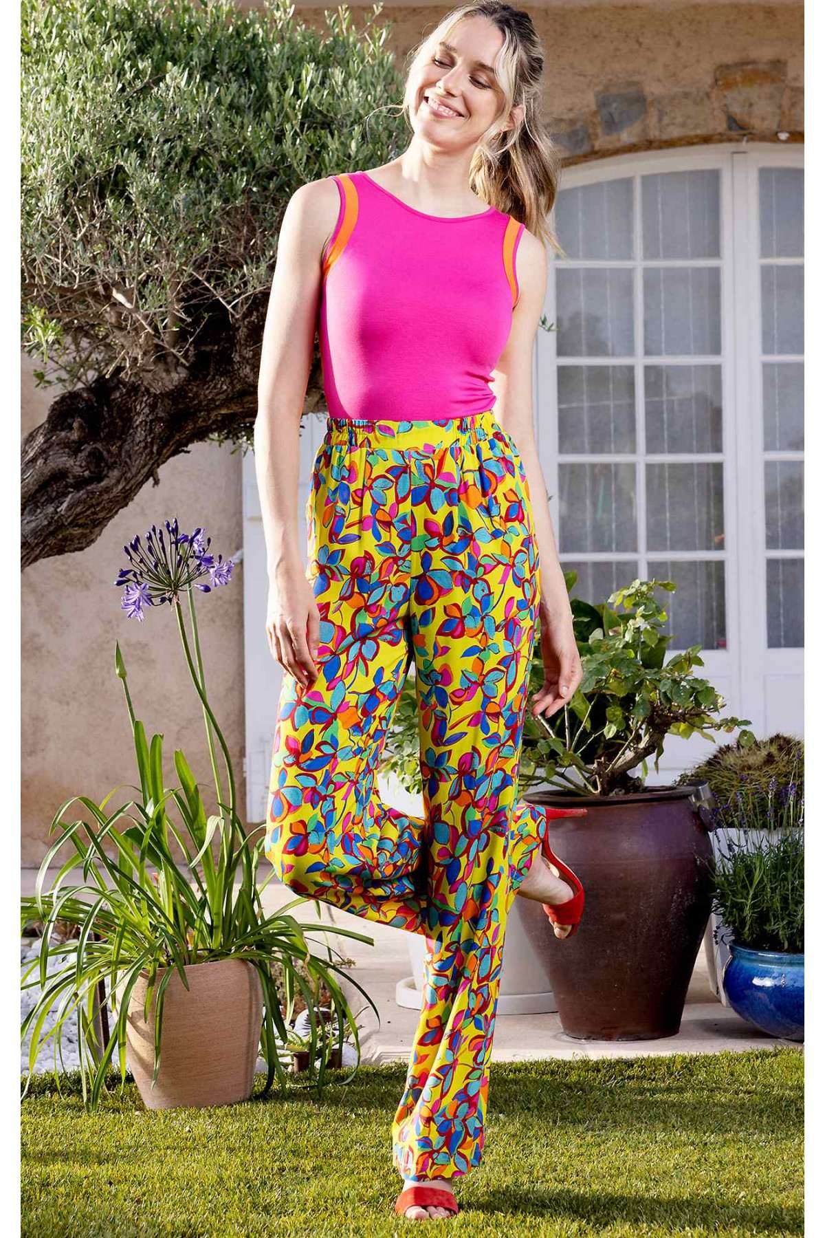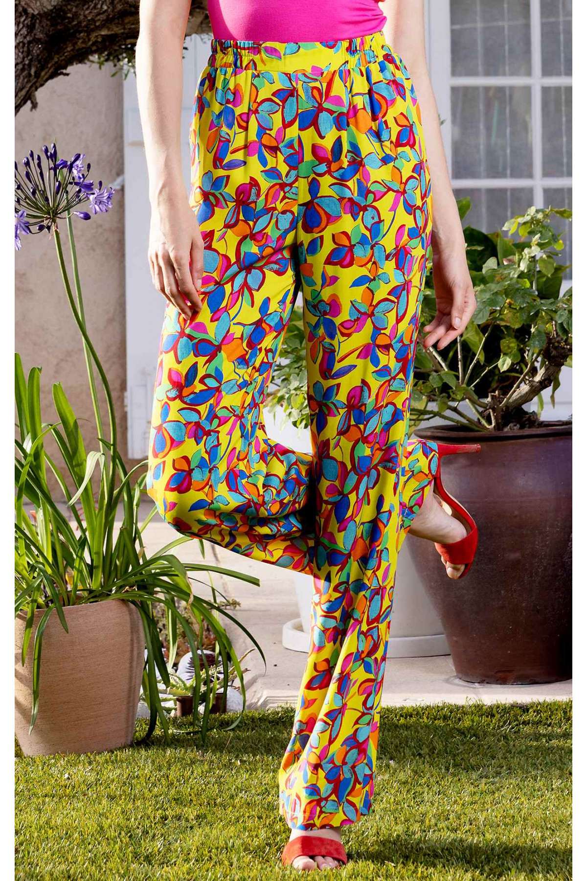 Pantaloni vaporoși de vară, confecționați din viscoză cu imprimeu artistic intens, cu care nu veți rămâne neobservată. Designul este o adevărată încântare cromatică – motive florale frumoase în nuanțe intense de roșu, albastru și verde pe fond galben. Elasticul din talie și cracii largi creează o senzație de ușurință și libertate de mișcare și îi fac potriviți atât pentru viața de zi cu zi, cât și pentru ocazii mai elegante. Pantalonii sunt ideali pentru vară, aceștia combină confortul cu un aspect impresionant și poate fi asortat cu gama variată de bluze monocrome din colecția Daphne.