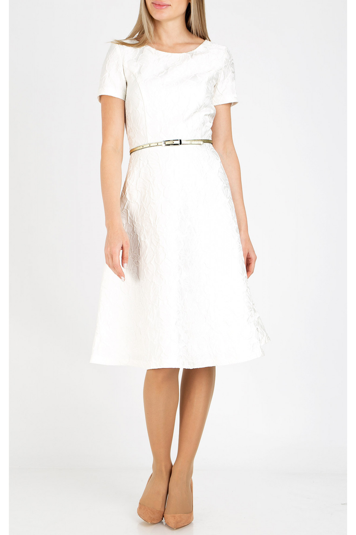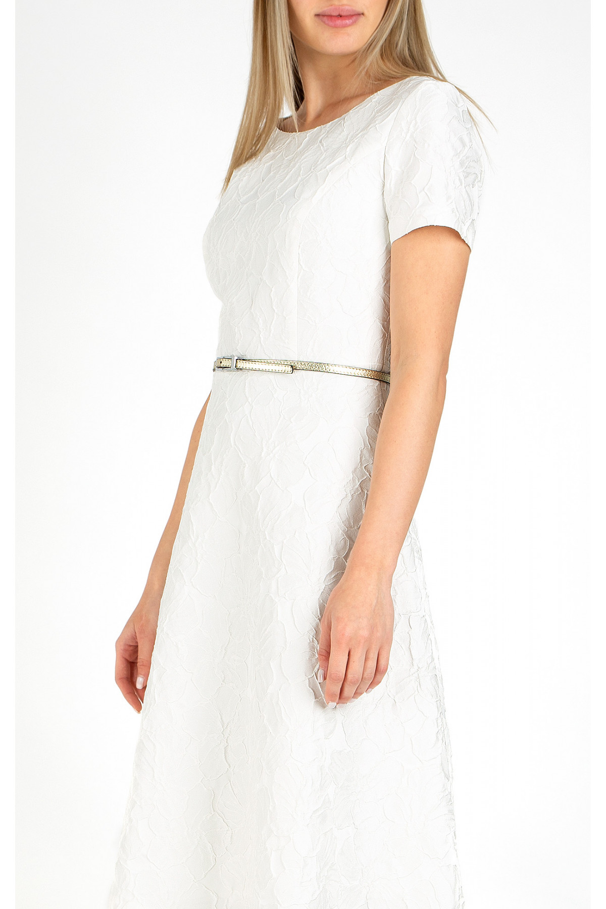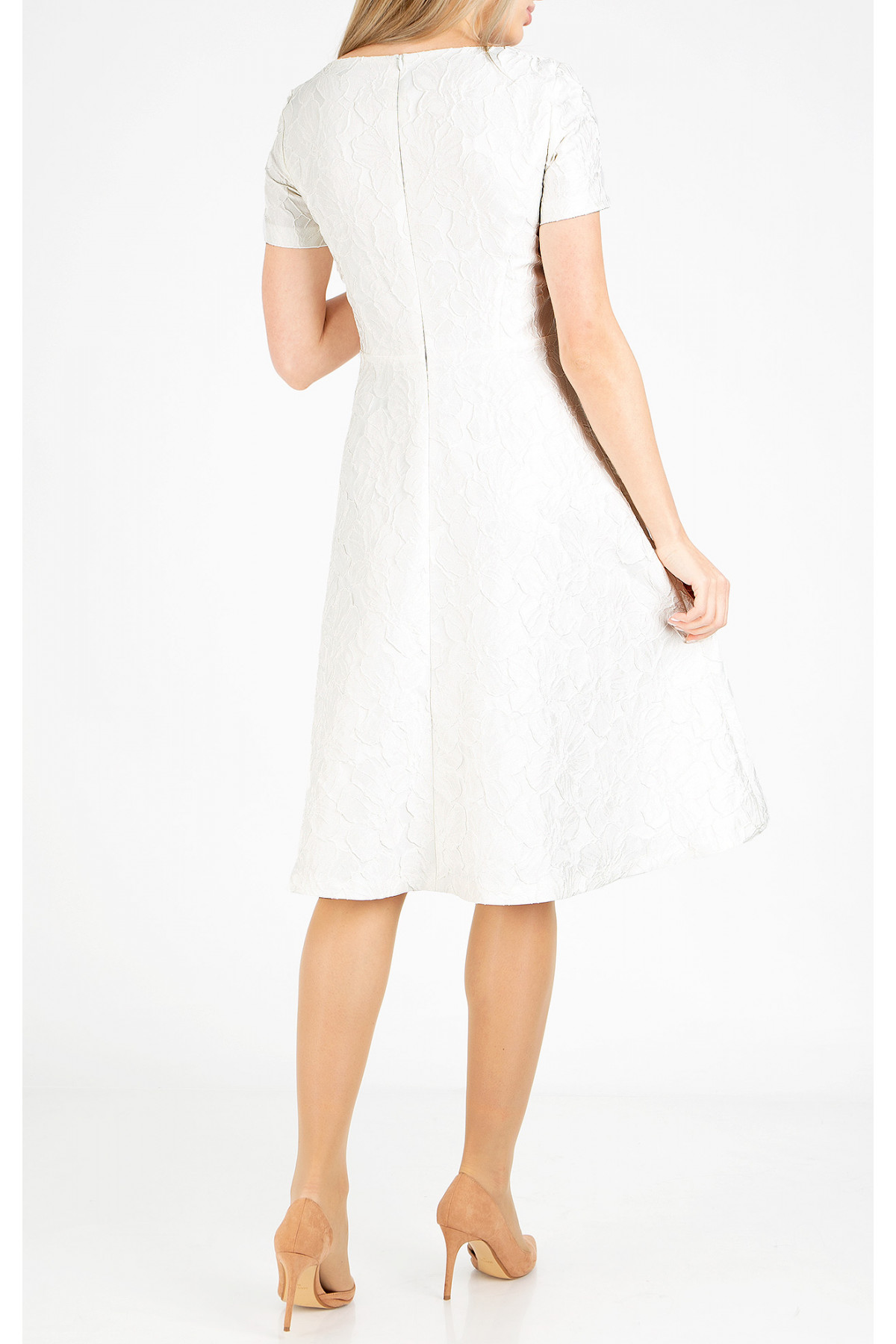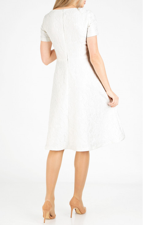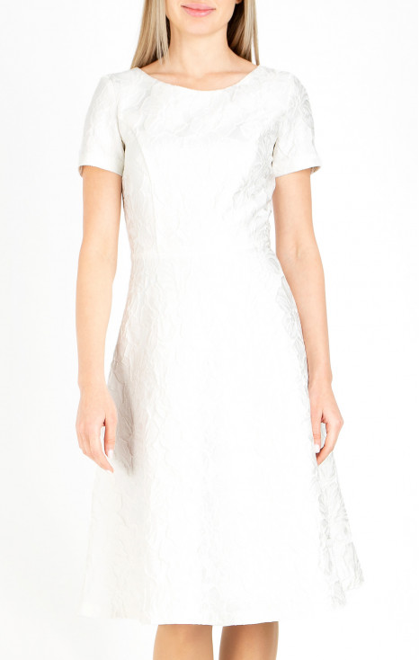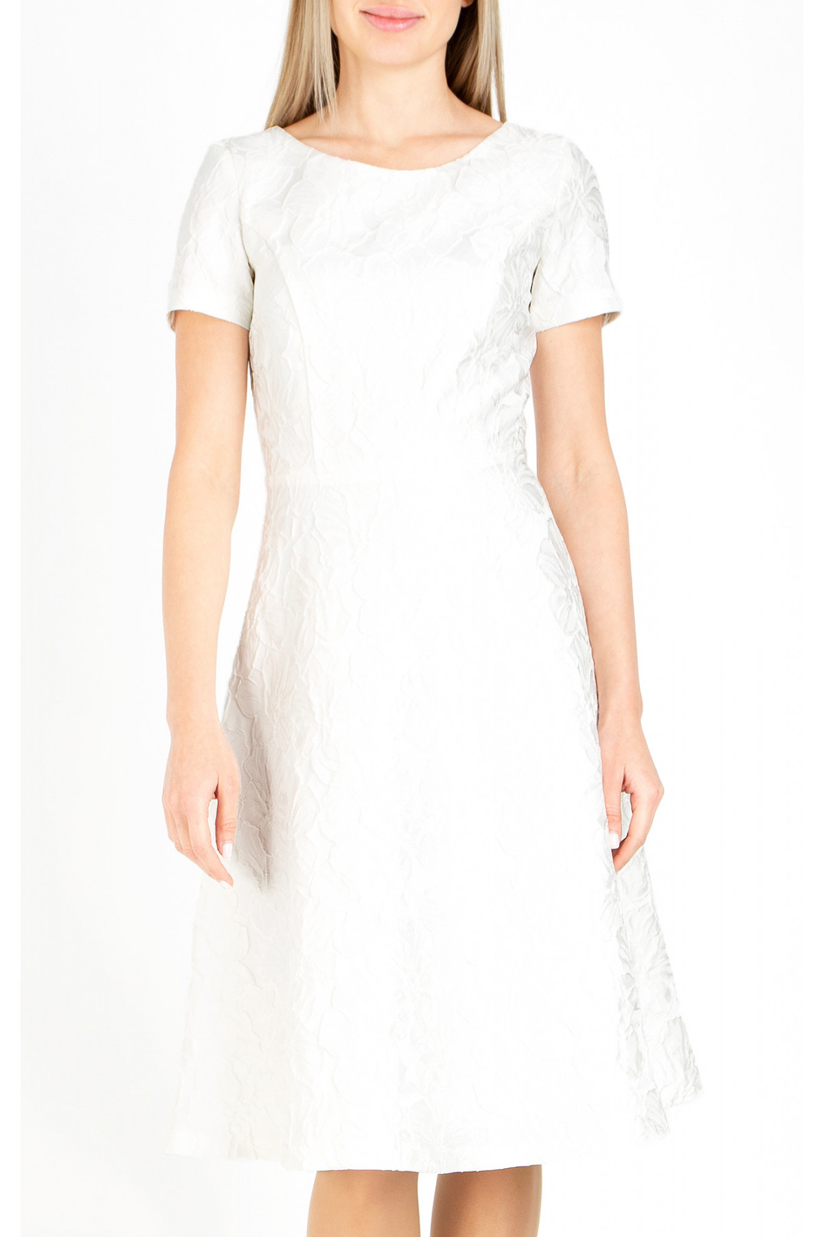 Rochie albă formală din jacquard satinat cu motive florale. O rochie extrem de stilată, confecționată din jacquard de lux cu luciu satinat și motive florale bogat înflorite. Modelul rochie are partea de sus ajustată și o evazare de la talie în jos, mânecă scurtă și decolteu tip barcă, concepută în lungime midi, închidere cu fermoar ascuns pe spate. Această rochie minunată este o alegere excelentă pentru evenimentele dvs. speciale. Confecționată în mărimile de la 36 până la 44.