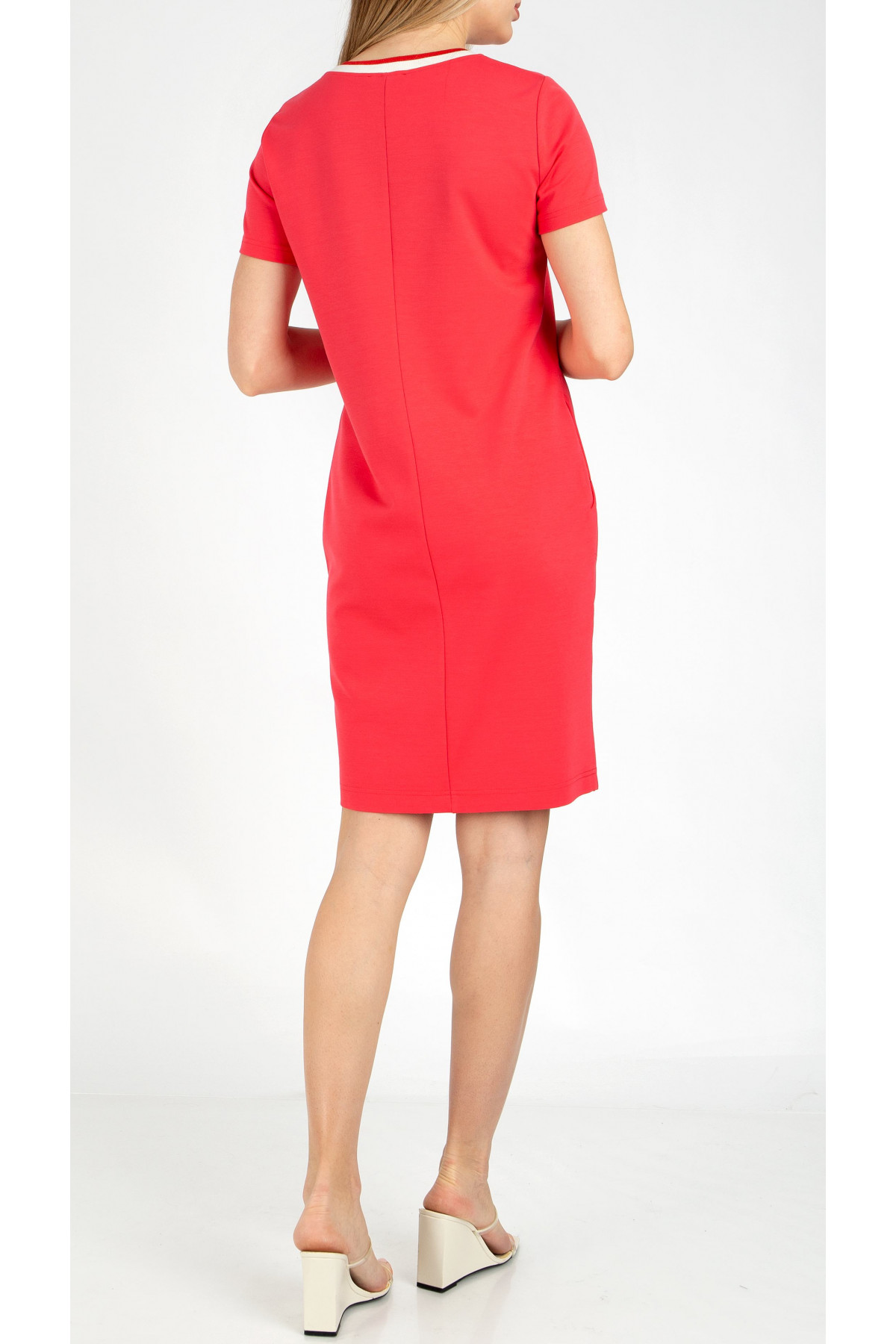 Rochie casual cu lungime în jurul genunchilor, în stil sport-elegant, confecționată dintr-un material de tricot elastic - un amestec fin de viscoză, poliamidă și elastan. Decolteul este subliniat cu o bordură tricotată elastică, care accentuează aspectul său elegant. Silueta lejeră o face o alegere potrivită atât pentru viața dinamică de zi cu zi, cât și pentru timpul liber.