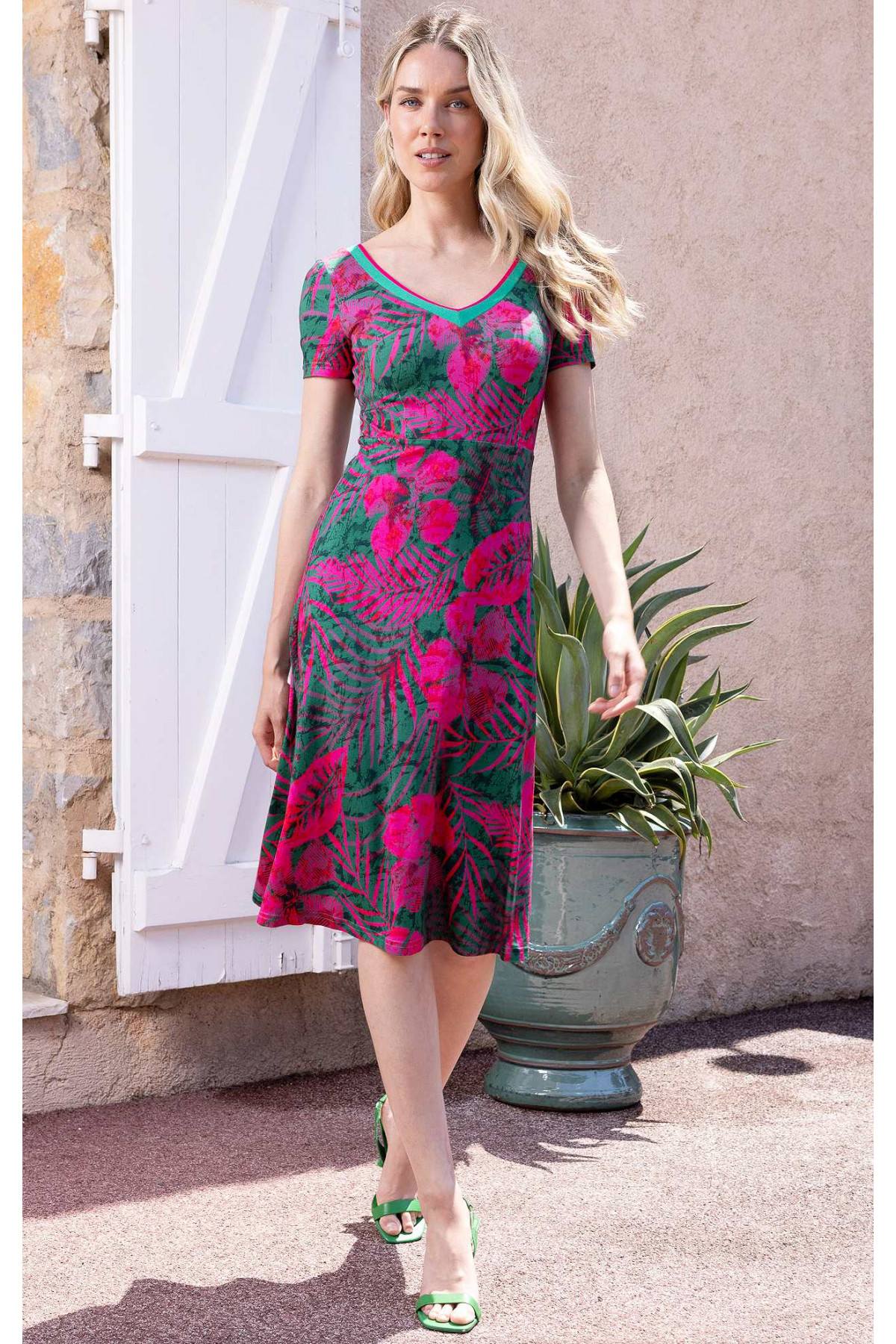 Rochie elegantă în stil sport-elegant, cu lungime sub genunchi, confecționată dintr-un material de viscoză cu elastan, de culoare Evergreen cu motive florale în Fuchsia Rose. Modelul rochiei are partea de sus mulată, și ușor evazată spre tiv, cu mânecă scurtă. Decolteul este accentuat de o bordură bicoloră, care adăugă un accent aspectului rochiei. Silueta lejeră o face potrivită atât pentru viața de zi cu zi dinamică, atât pentru timpul liber.