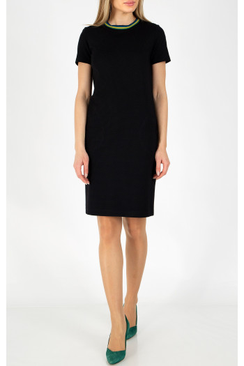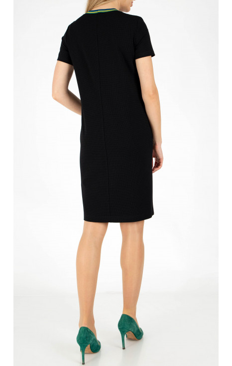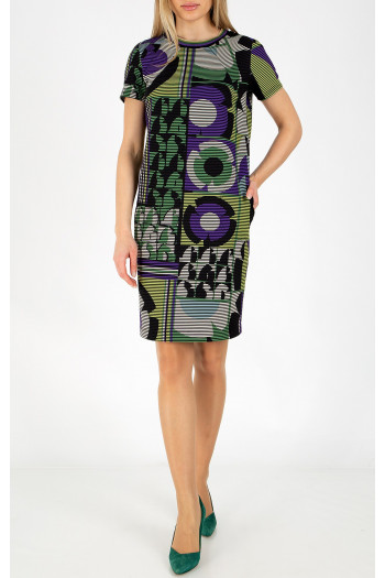 Rochie confortabilă dintr-un material de tricot de lux, de culoare Nugget gold cu un imprimeu grafic. Modelul are siluetă lejeră, iar partea de jos este puțin mulată, lungime clasică în jurul genunchilor, cu buzunare și decolteu rotund completat de o bandă tricoloră. Potrivită pentru orice ocazie, de asemenea și pentru birou. Se oferă în mărimile de la 36 la 48.