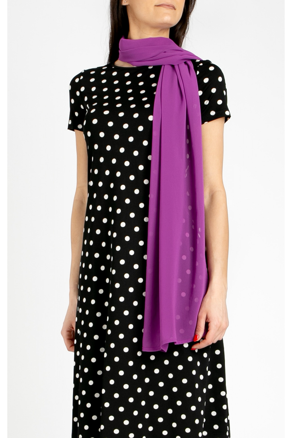 Rochie elegantă din jerseu negru de lux cu imprimeu „Polka dots”. Modelul are decolteu rotund, mânecă scurtă și lungime până la genunchi, având o linie A care cade natural pe corp și asigură confort și libertate de mișcare. Această rochie este potrivită atât pentru viața de zi cu zi, cât și pentru întâlniri de seară elegante sau evenimente de zi stilate.