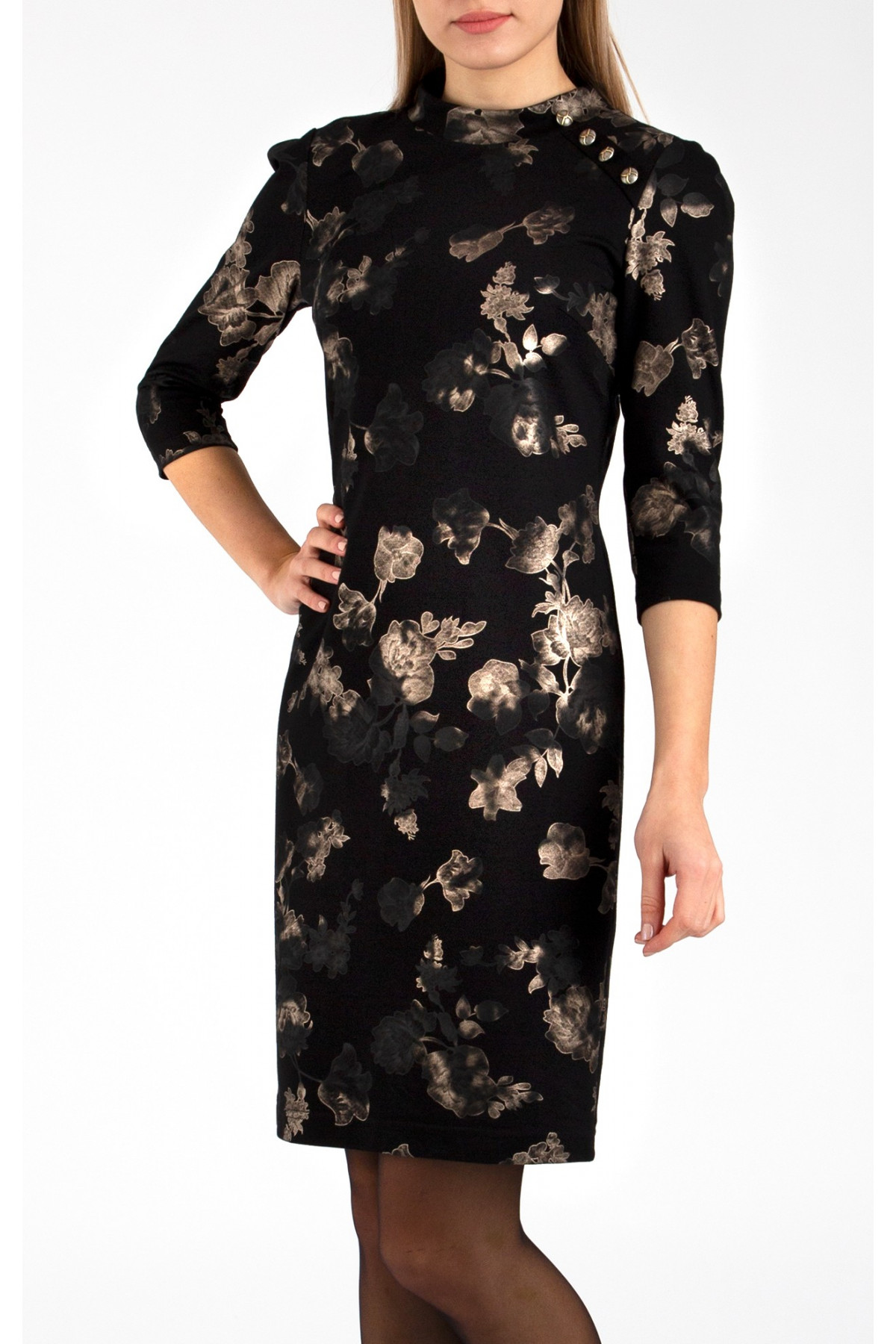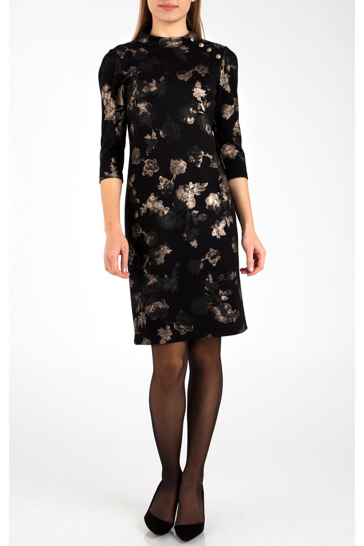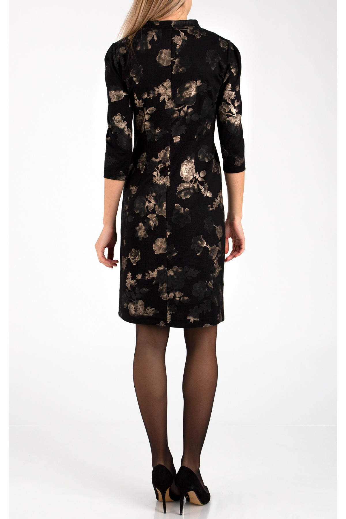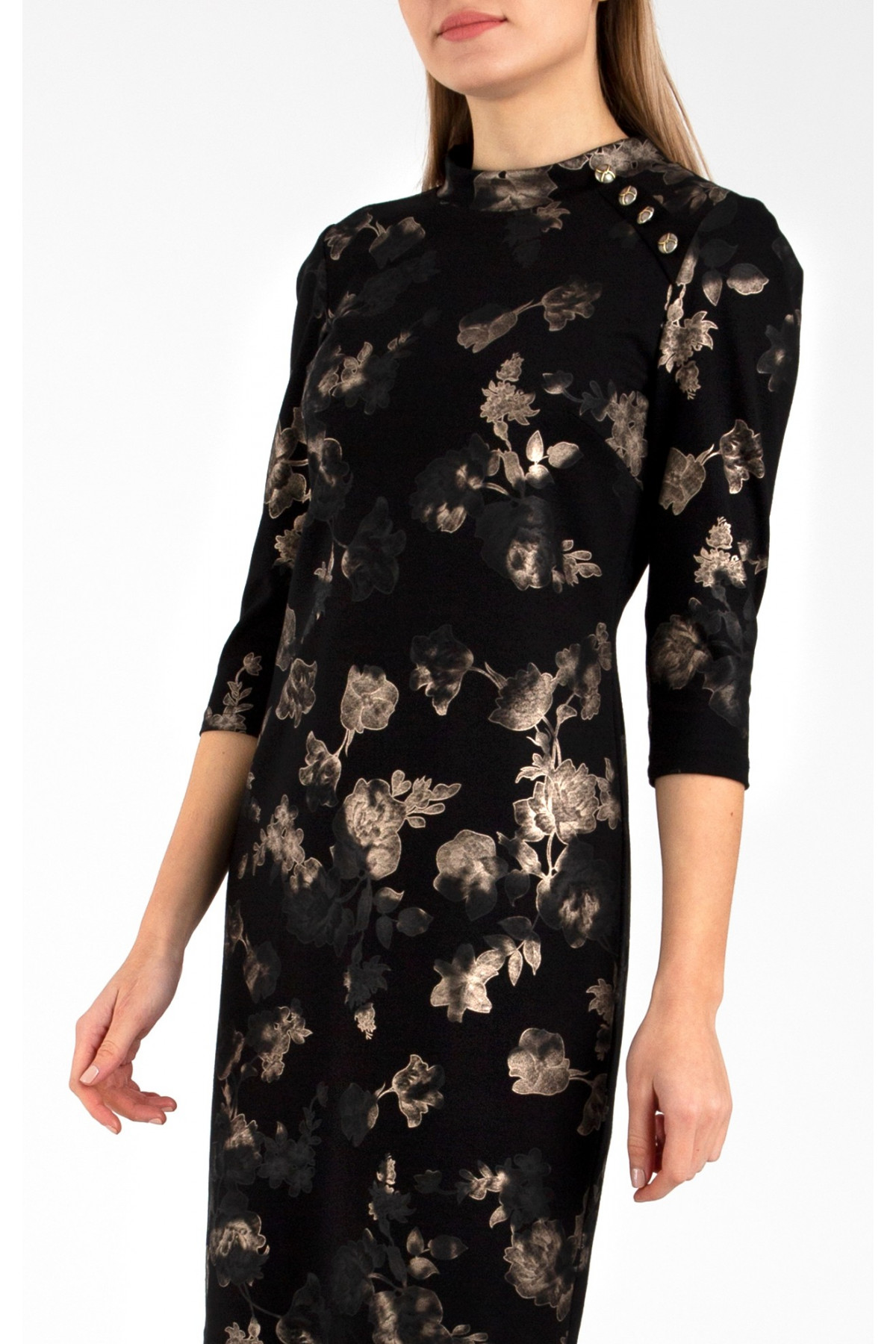 Rochie dreaptă spectaculoasă în negru, cu motive florale, cu strălucire metalizată. Modelul are scurt guler polo și mânecă 3/4, accentuate cu nasturi decorativi aurii și o lungime clasică la genunchi. Fără căptușeală.