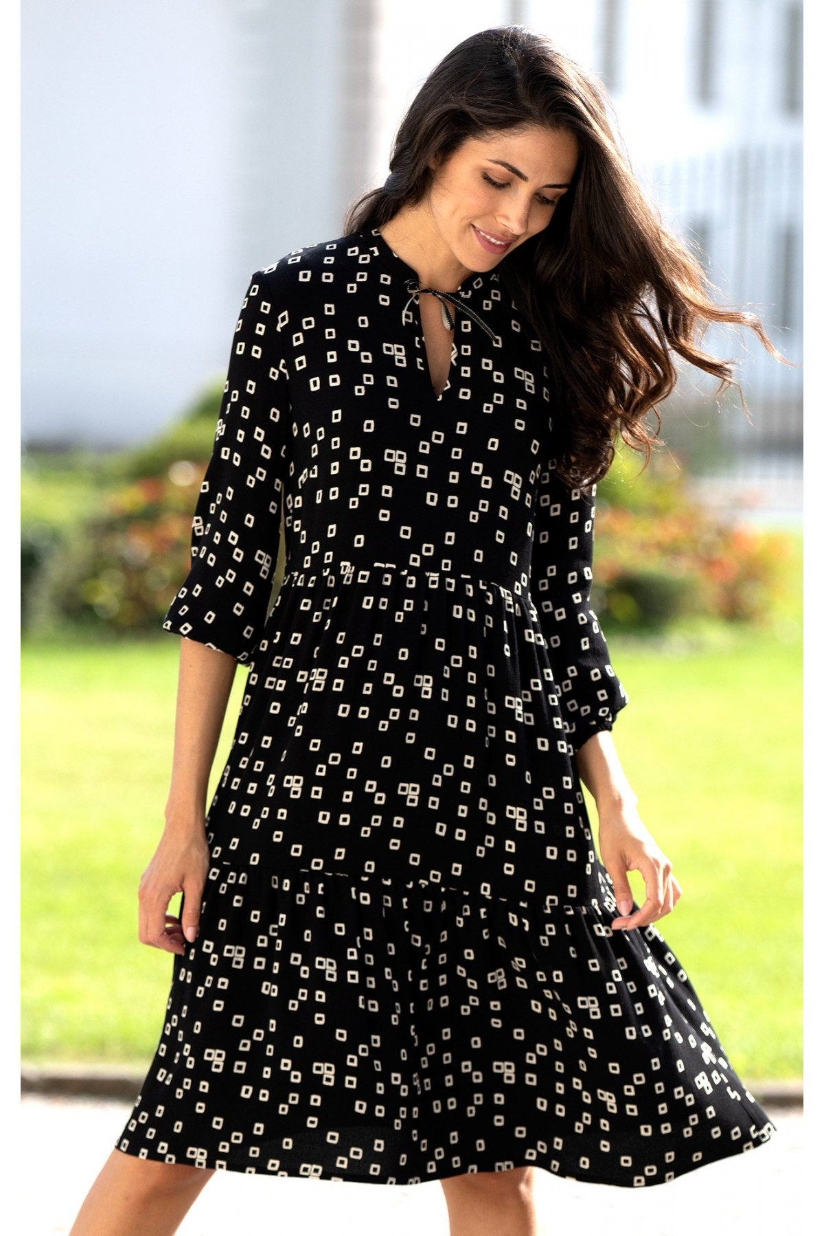Rochie elegantă din vascoză. Modelul are lungimea sub genunchi si mânecă 3/4. Siluetă liberă oferă o senzație de confort și libertate de mișcare. În print grafic pe o bază neagră. Fără căptușeală.