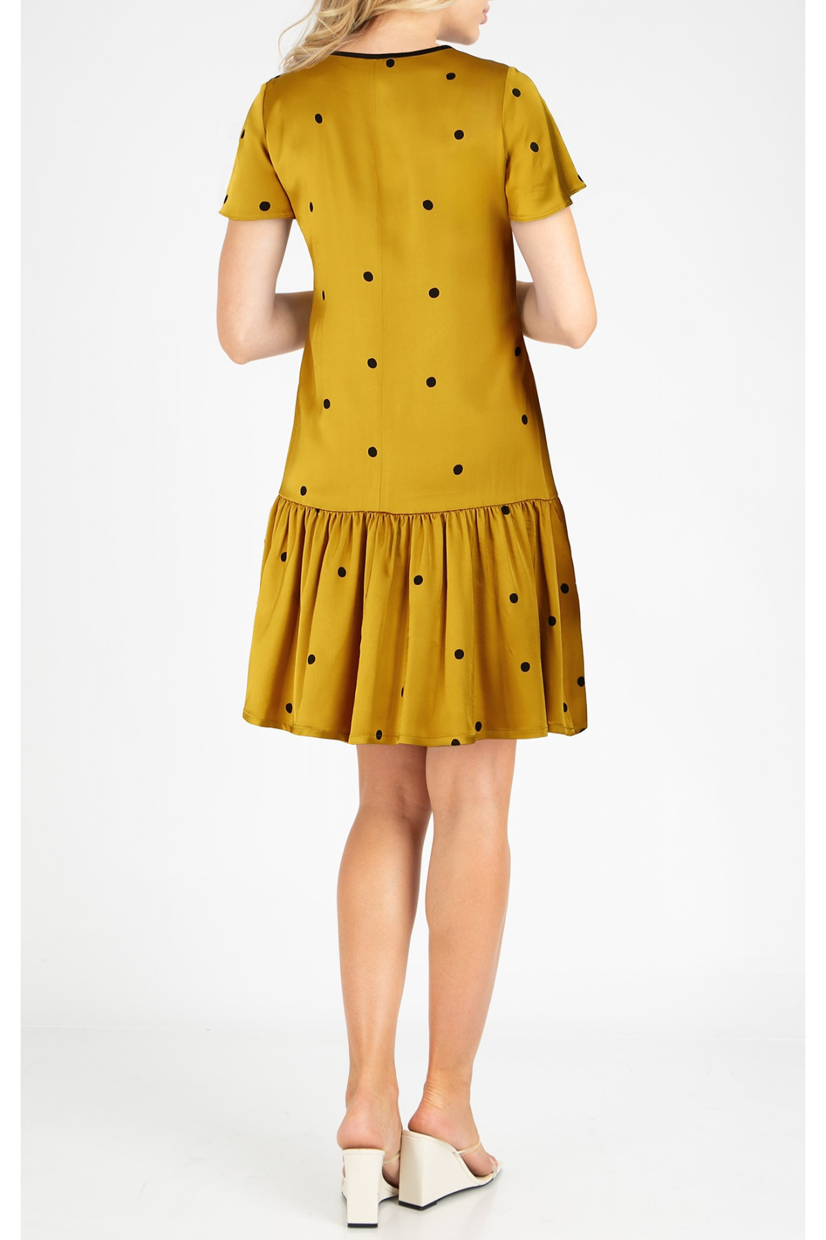 Rochie scurtă elegantă, din viscoză satinată de lux cu elastan, de culoarea „muștar”, cu imprimeu Polka dots.