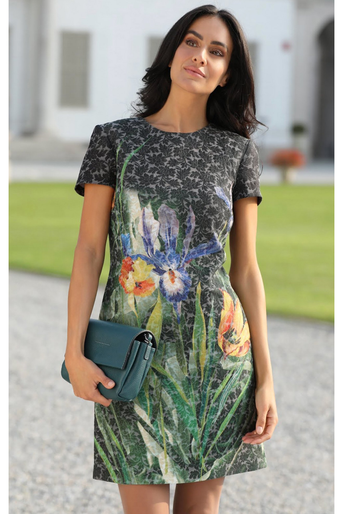 Rochie mini elegantă, realizată din jacard luxos, cu un superb model floral. Modelul are mânecă scurtă, lungime deasupra genunchiului și închidere cu fermoar ascuns la spate. Materialul este dens, cu o ușoară elasticitate, și conturează elegant silueta fără să limiteze mișcările. Imprimeul bogat cu iriși oferă prospețime și un caracter unic ținutei. Potrivită pentru ocazii mai elegante și evenimente speciale.