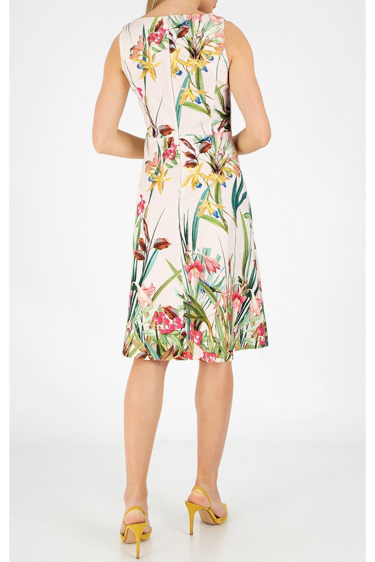 Rochie elegantă din jacquard de bumbac, de culoare Papyrus cu imprimeu floral. Modelul rochiei are partea de sus mulată și o fustă ușor evazată, decolteu tip barcă, care se închide cu fermoar ascuns pe spate.