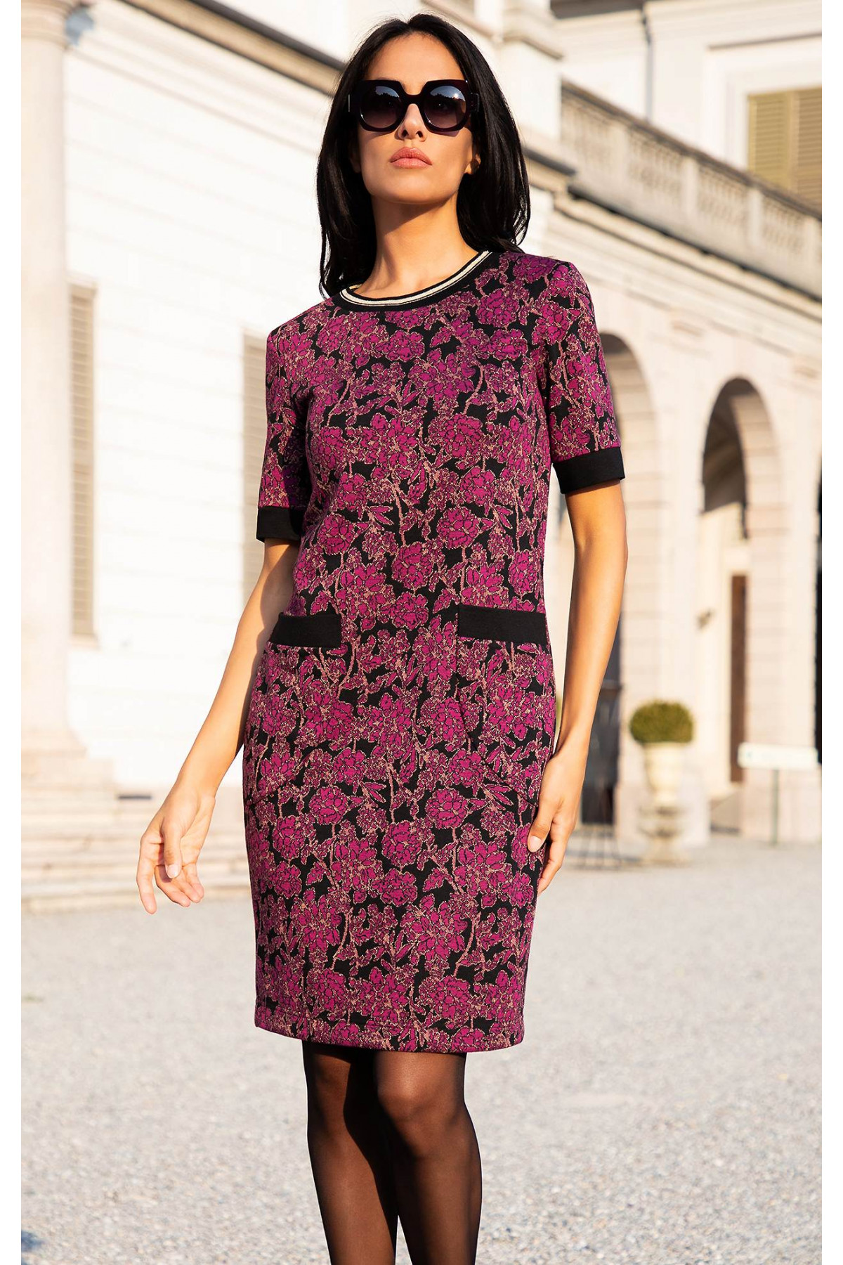 O rochie stilată are impresionează prin echilibrul fin între confort și rafinament. Confecționată din jacquard de tricot dens, cu un motiv floral în nuanța Magenta Haze pe fundal negru și fire aurii care adaugă un accent strălucitor. Croiala lejeră asigură un confort maxim, iar ușoara ajustare în partea inferioară subliniază linia feminină. Modelul rochiei are mânecă scurtă, buzunare exterioare funcționale și o bordură tricotată decorativă în negru și auriu pentru o notă modernă. Aceasta este potrivită atât pentru evenimente profesionale, cât și pentru întâlniri informale.