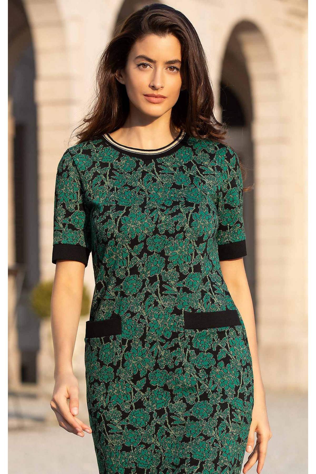 Rochie elegantă din jacquard tricotat, cu elemente florale, în Evergreen, cu fire aurii.