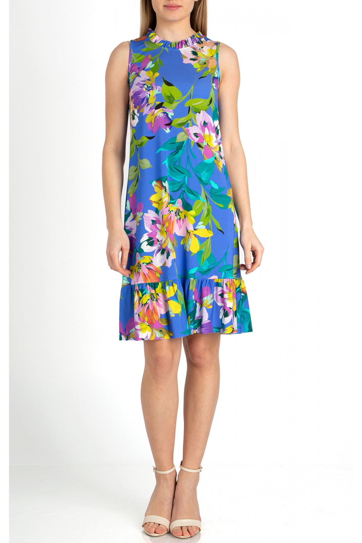 Rochie elegantă confecționată din jerseu solid de lux, concepută cu imprimeu floral colorat. Materialul elastic și silueta lejeră conferă senzație de confort de vară și libertate a mișcărilor.