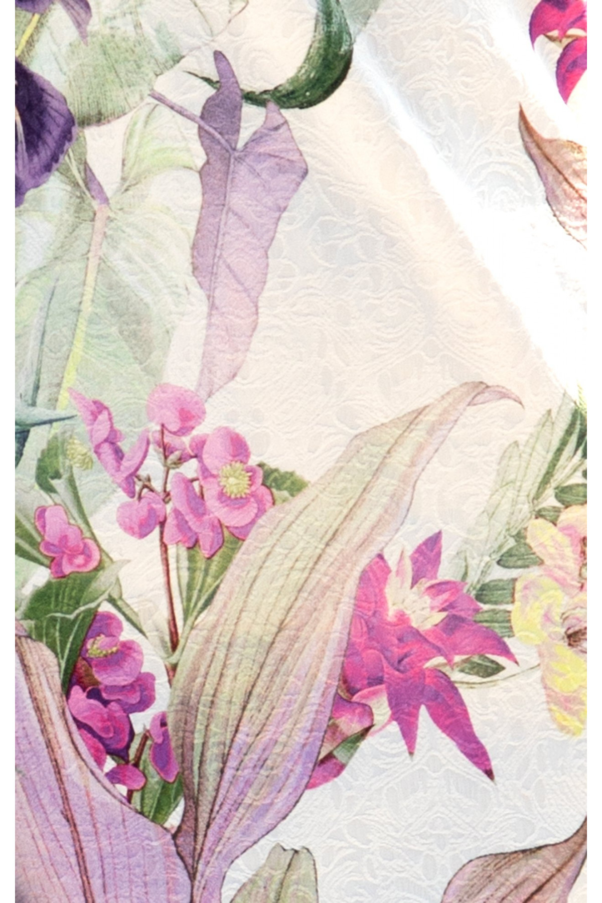 Rochie elegantă dreaptă din jacquard de bumbac alb cu motive florale mov
