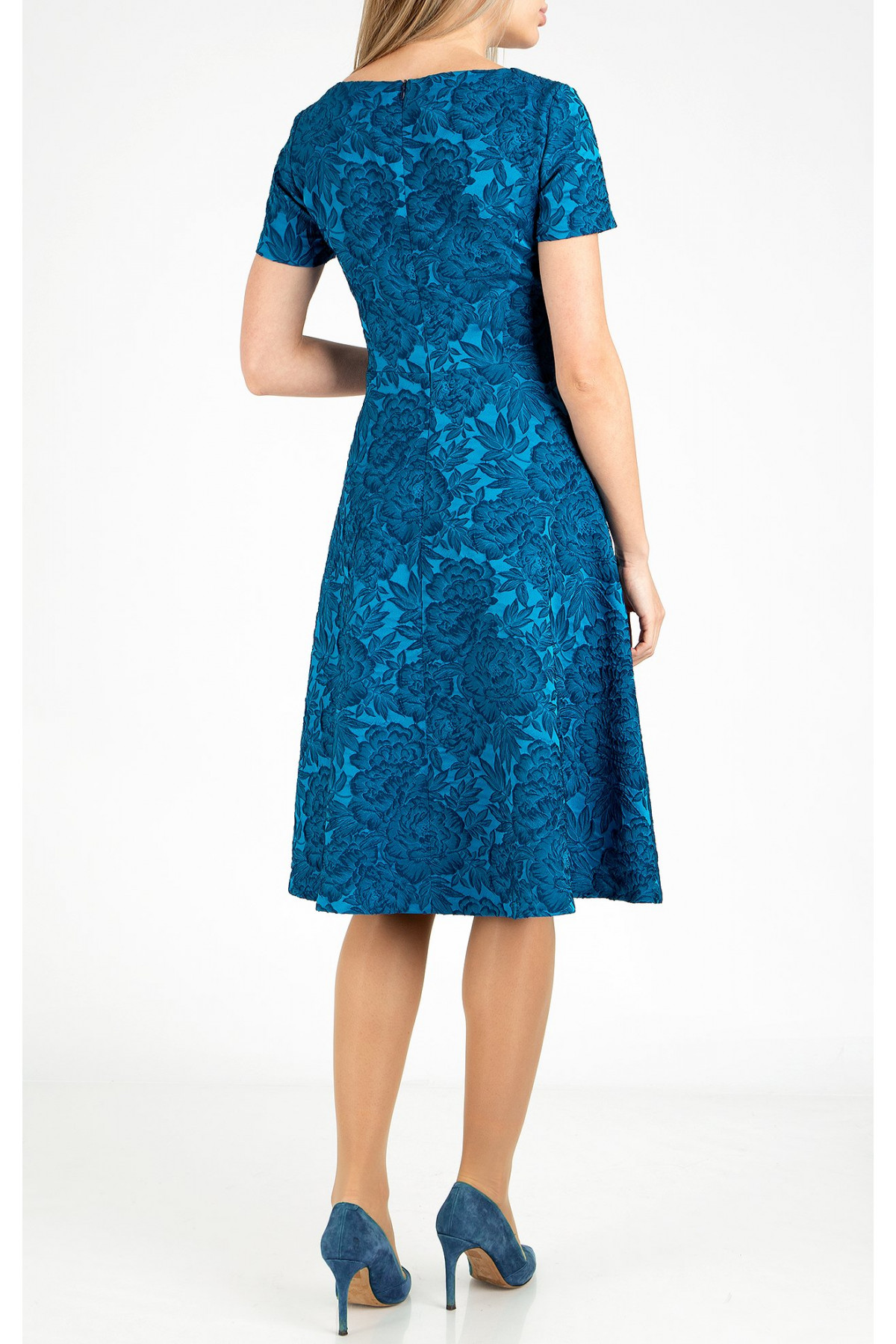 Rochie evazată formală din jacquard satinat de culoare Blue Sapphire cu motive florale frumoase. O rochie extrem de elegantă, confecționată din jacquard de lux cu un luciu satinat, conferindu-i eleganță și stil. Modelul rochie are partea de sus mulată și o evazare de la talia în jos, cu mânecă scurtă și decolteu tip barcă, concepută în lungime midi. Această rochie este potrivită pentru evenimentele dvs. speciale. Rochia este disponibilă în mărimile de la 36 până la 44.