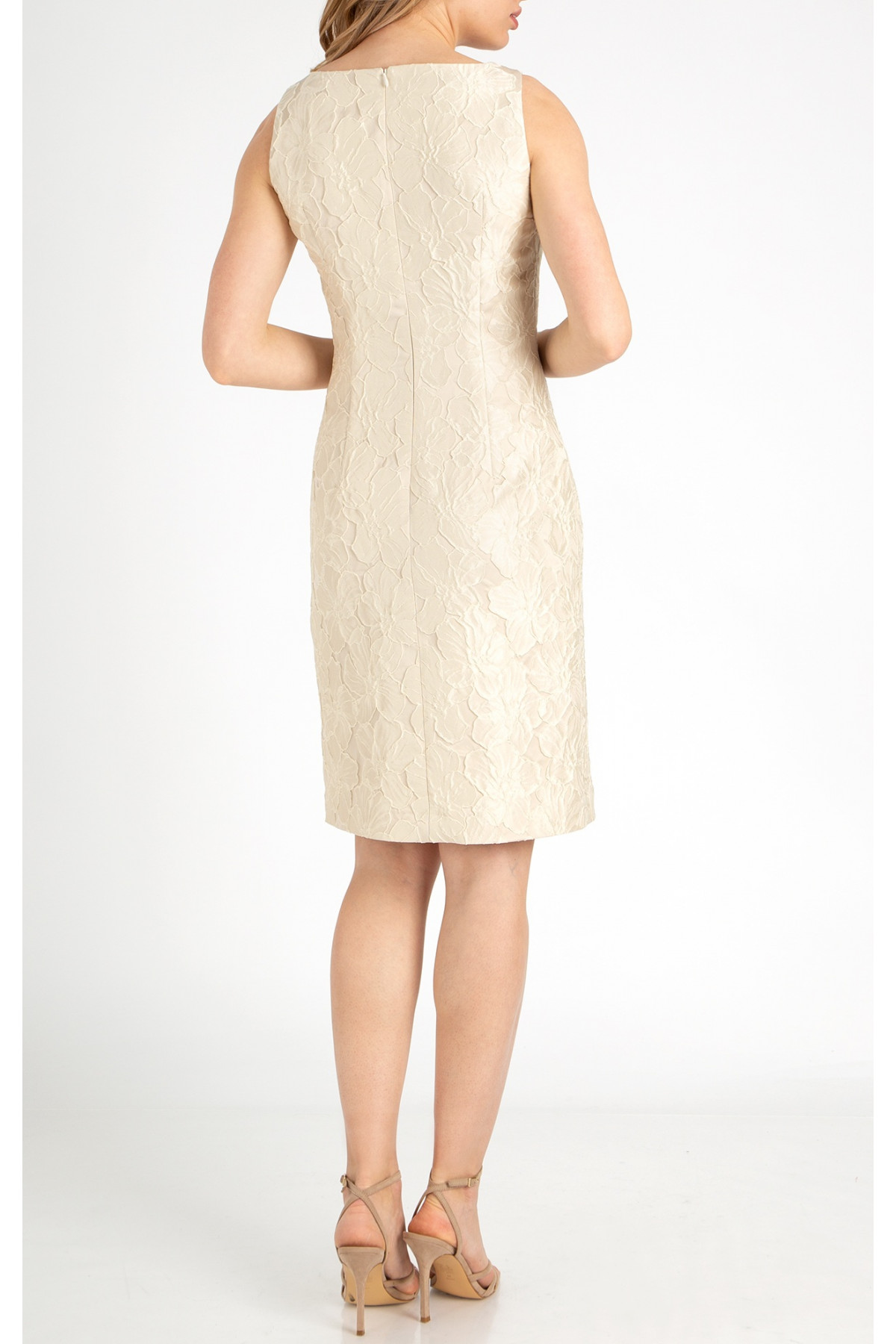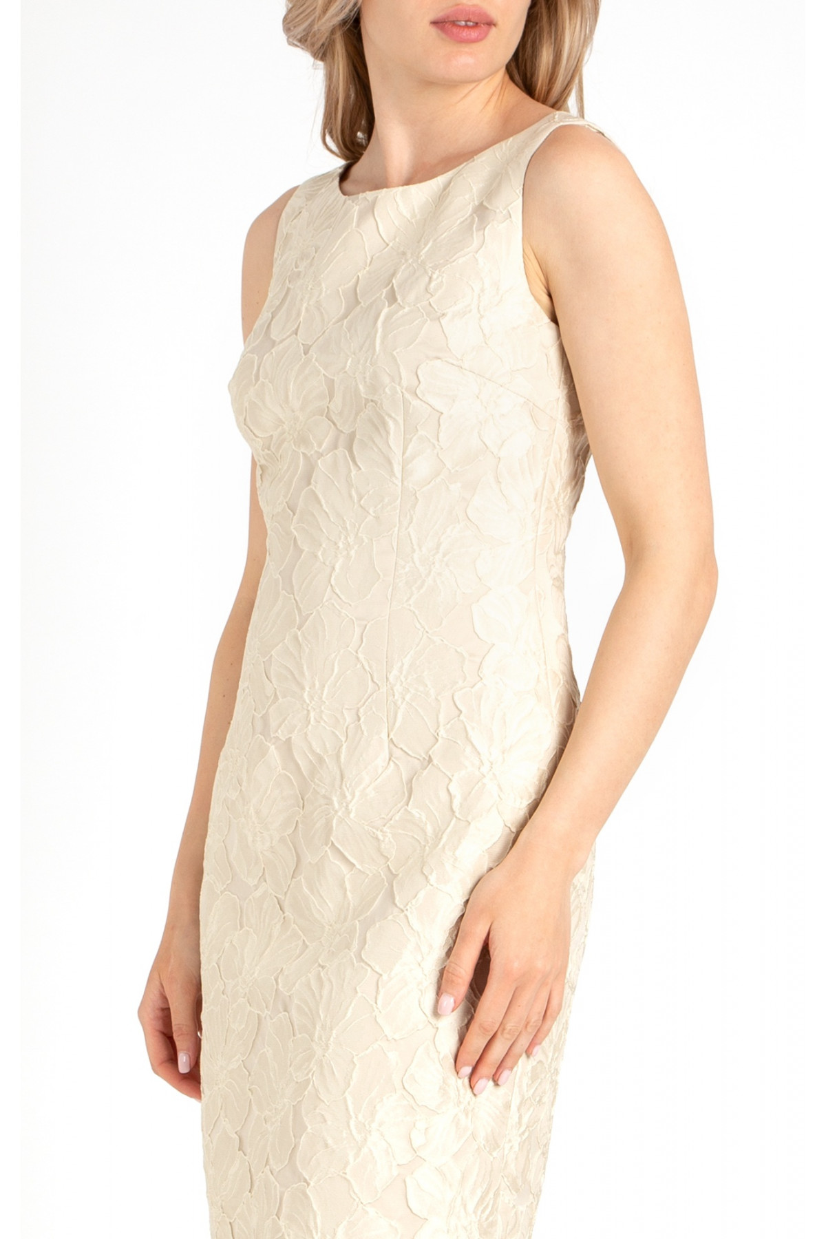 Rochie formală din jacquard în relief cu motive florale de culoare bej-nisip cu strălucire satinată. Această rochie stilată, conferă un aspect elegant, cu care puteți cu care puteți fascina pe toată lumea. Acest model are siluetă dreaptă, fără mâneci, cu o decolteu delicat tip barcă și lungime în jurul genunchilor. Cu o căptușeală și fermoar ascuns pe spate.