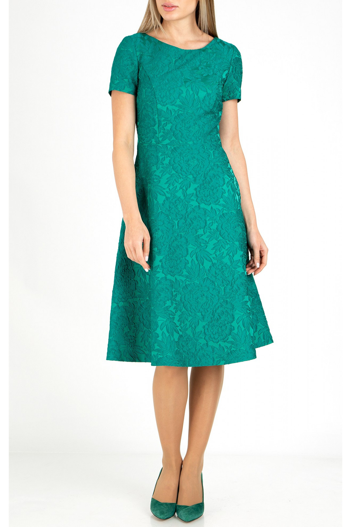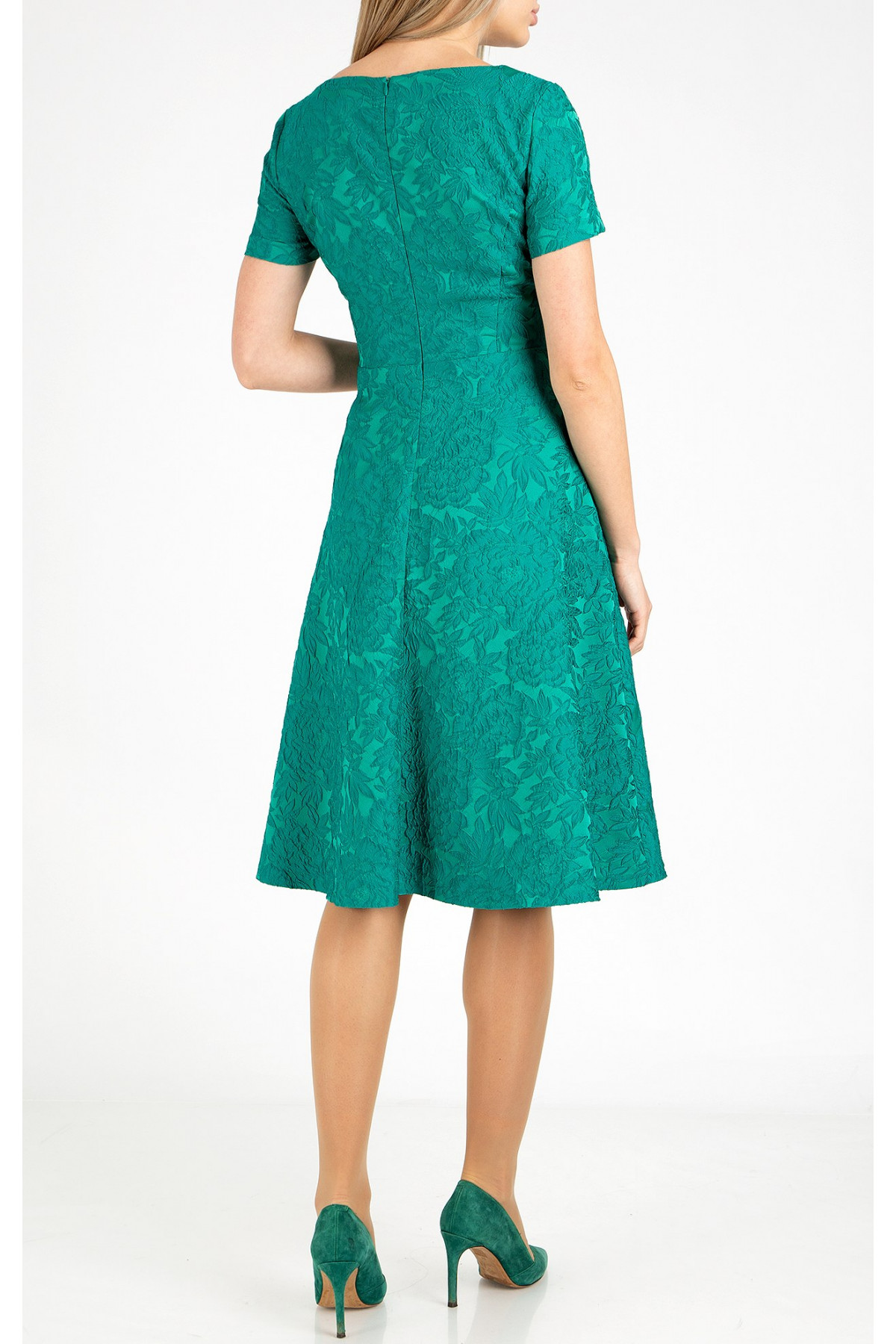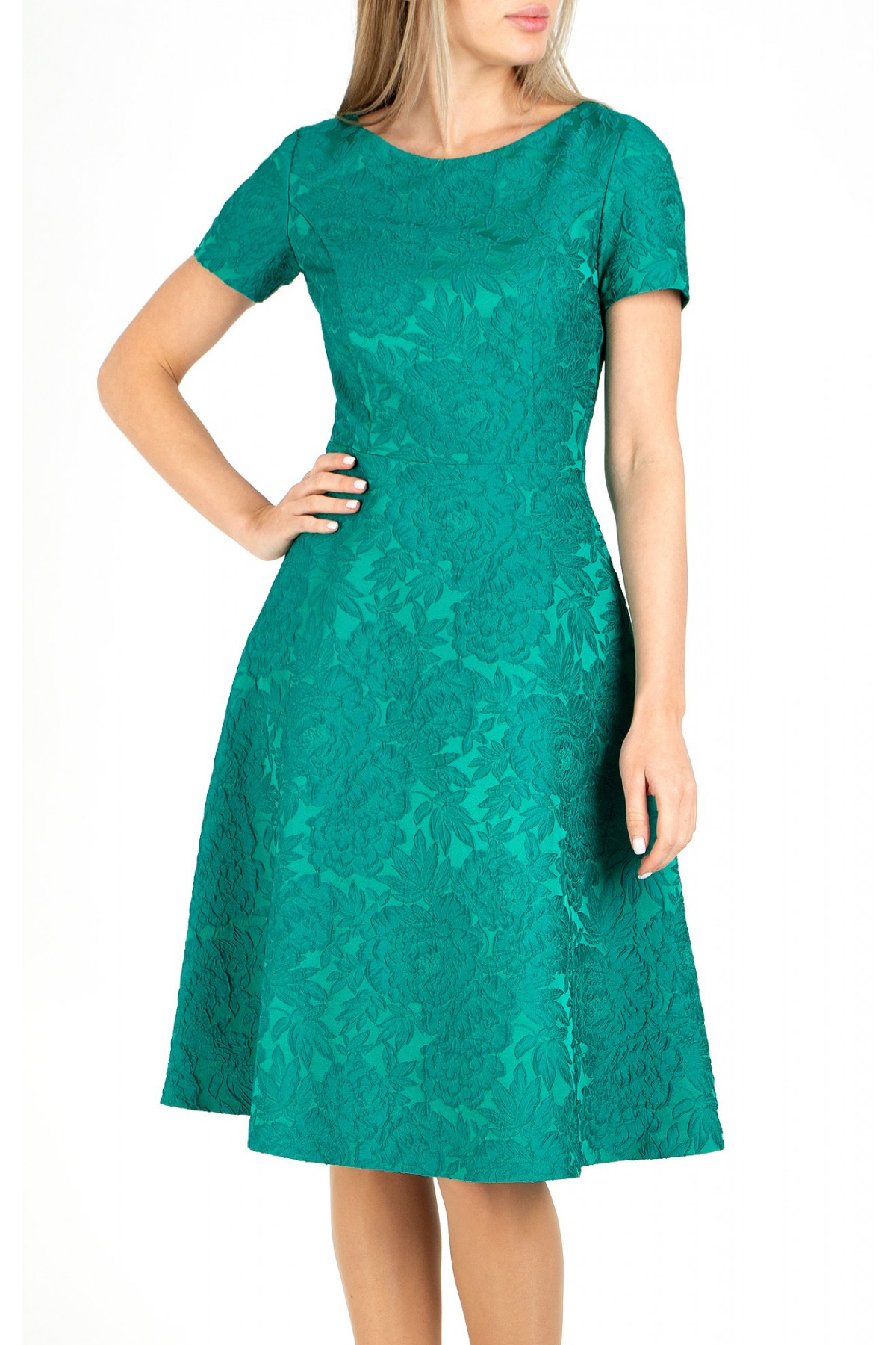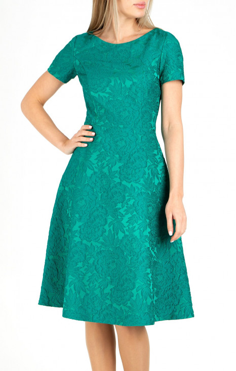 Rochie frumoasă formală din jacquard satinat de culoare Ultramarine Green cu motive florale. O rochie extrem de elegantă, confecționată din jacquard de lux cu un luciu satinat, conferindu-i eleganță și stil. Modelul rochie are partea de sus mulată și o evazare de la talia în jos, cu mânecă scurtă și decolteu tip barcă, concepută în lungime midi și căptușeală. Această rochie este potrivită pentru evenimentele dvs. speciale. Rochia este disponibilă în mărimile de la 36 până la 44.