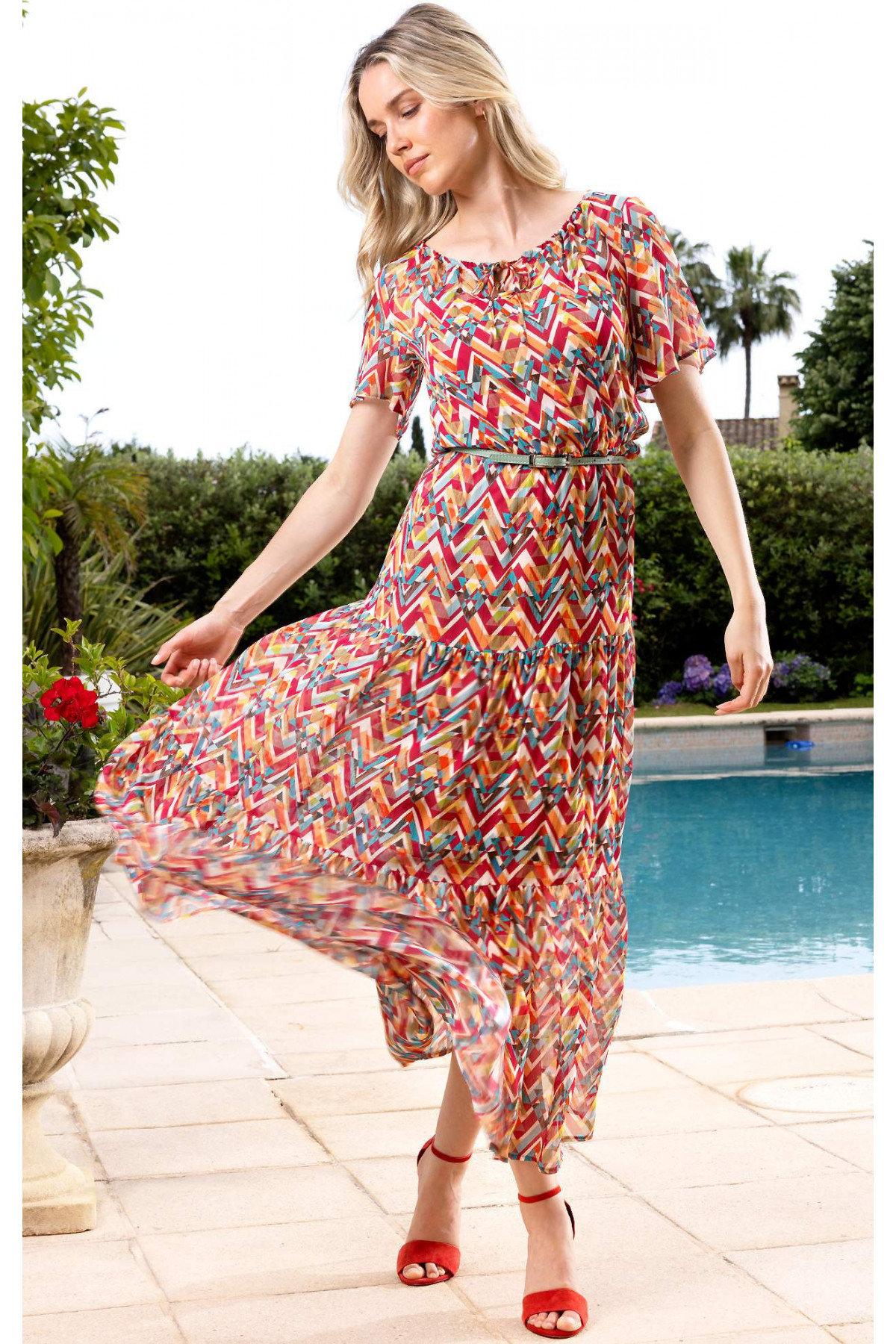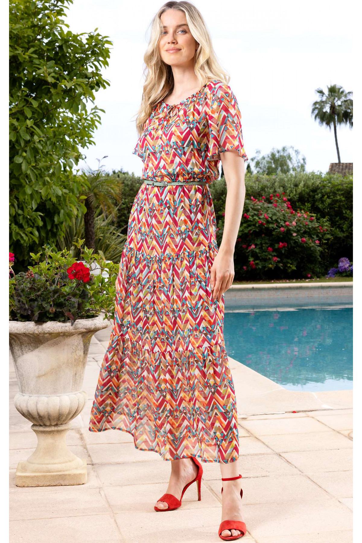 Rochie lungă vaporoasă cu volane din viscoză creponată într-un desen zigzag în nuanțe calde de coral