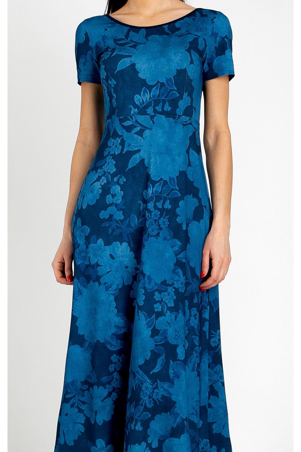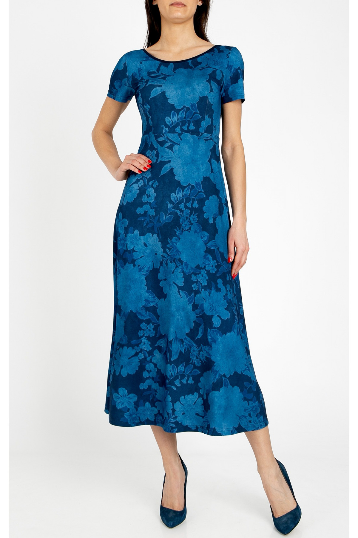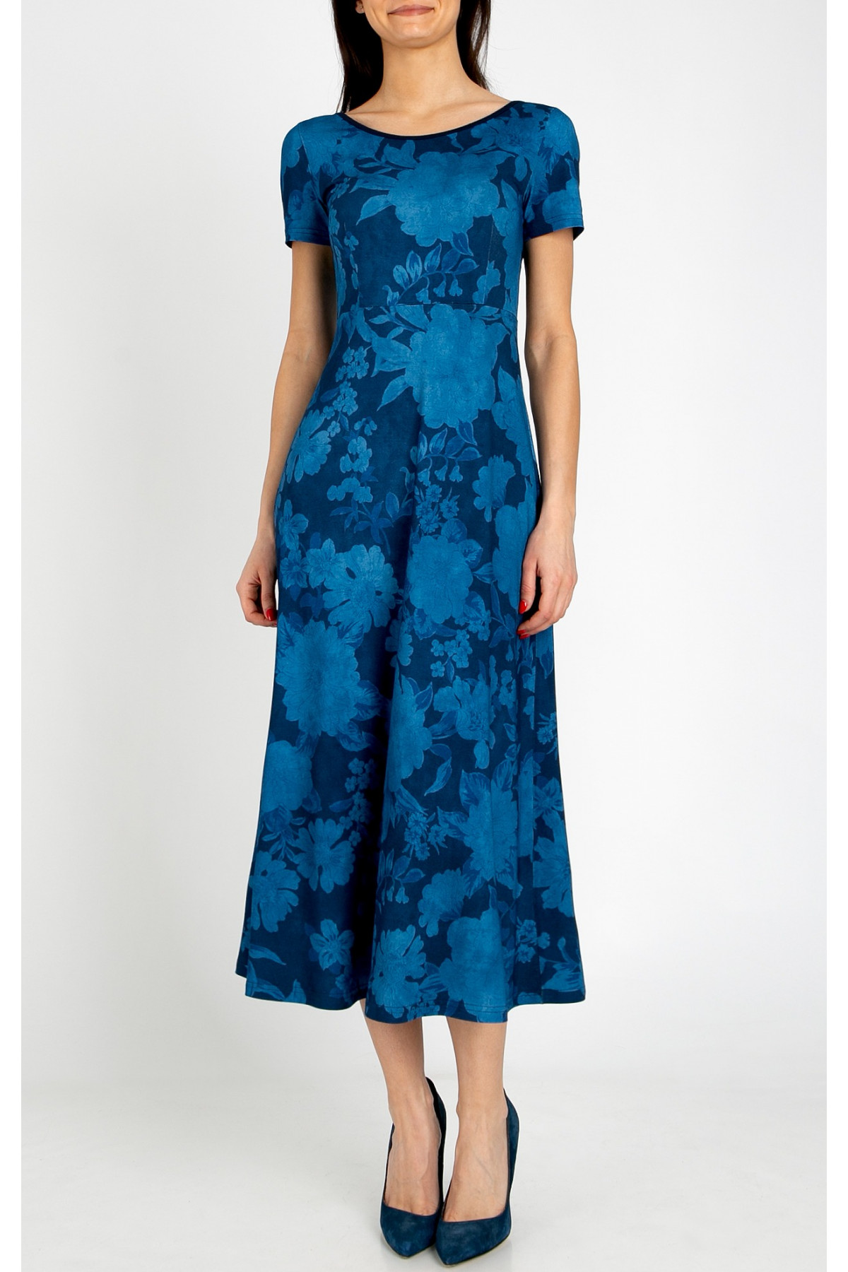 Rochie midi elegantă din tricot, care combină confortul materialului moale cu un design artistic. Partea superioară este ușor cambrată și se lărgește treptat spre poale, oferind libertate de mișcare. Modelul are mânecă scurtă, decolteu tip bărcuță și un spate adânc decupat în formă de U, care adaugă un accent surprinzător și feminin. Imprimarea florală pe fundal bleumarin conferă profunzime și stil.