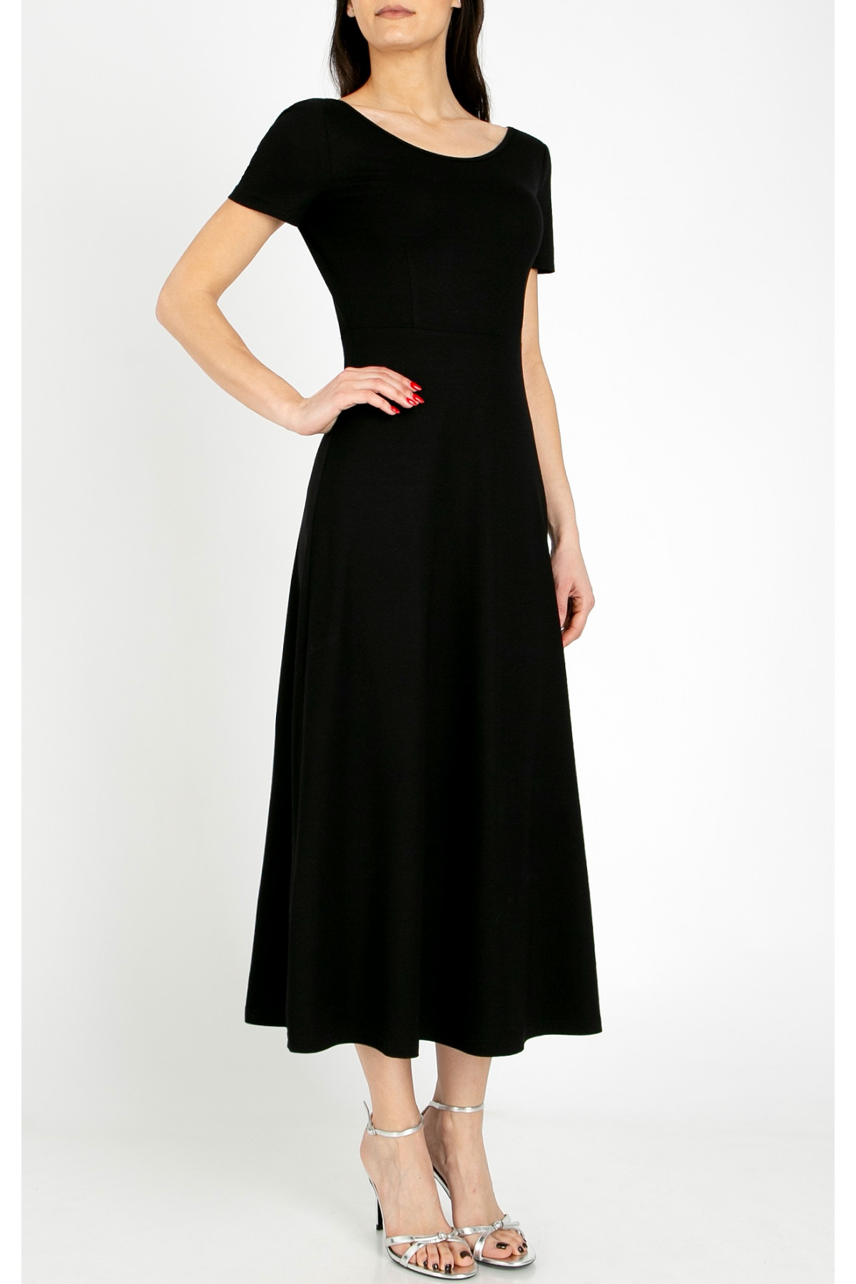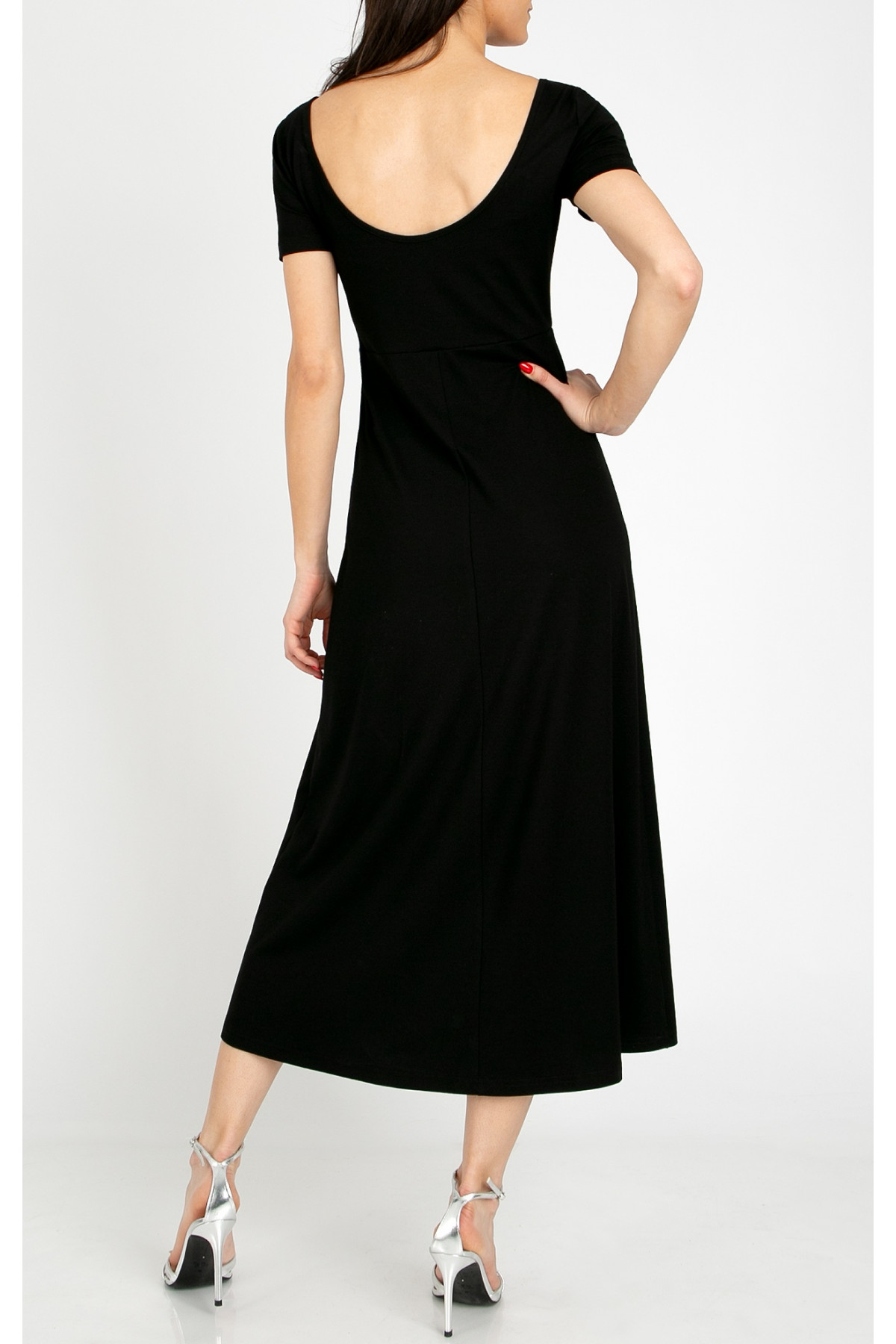 Rochie elegantă din tricot, în culoare neagră intensă. Modelul are partea superioară ușor cambrată, care se deschide treptat într-o linie amplă, oferind libertate de mișcare. Este prevăzută cu mânecă scurtă, decolteu tip bărcuță decorat cu logo din cristale Swarovski și un spate adânc decupat în formă de U, ce adaugă un aer elegant și feminin.