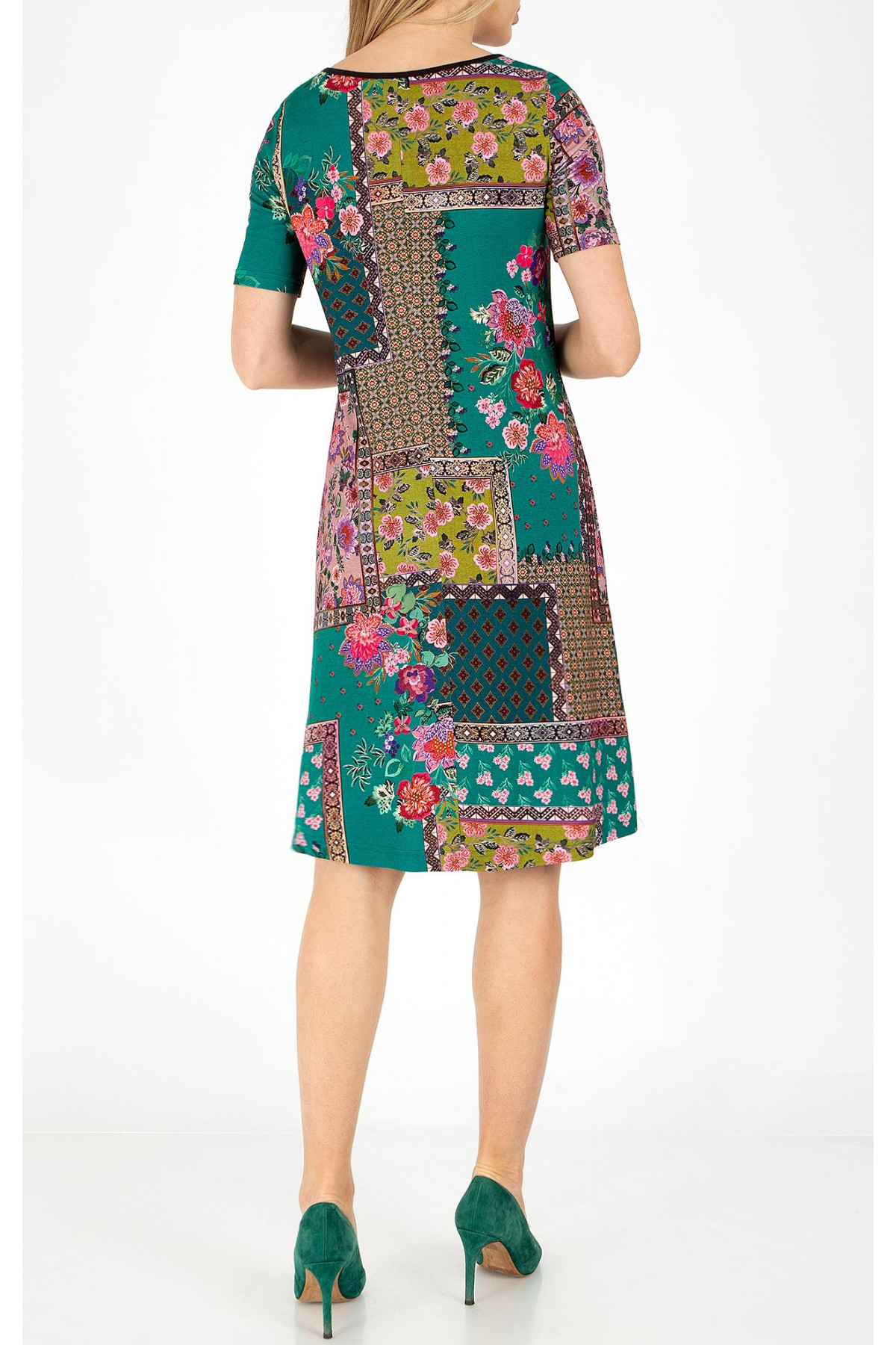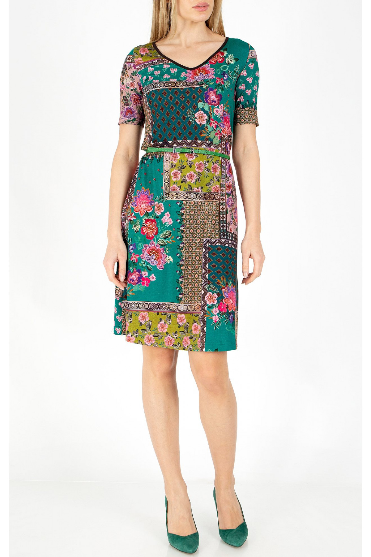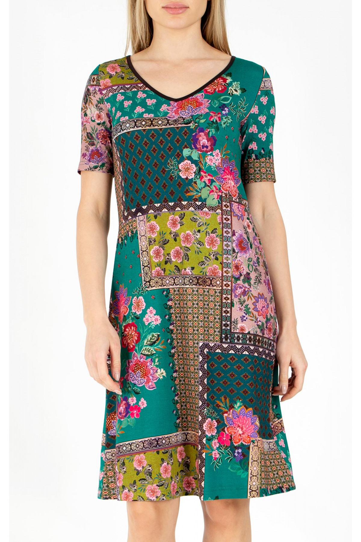 Rochie modernă în siluetă asimetrică cu imprimeu floral. Modelul rochiei este confecționat jerseu ușor, lungime clasică până la genunchi, mânecă scurtă, fără căptușeală. Silueta lejeră asigură confort și ușurință, fără a limita mișcările și este potrivit pentru orice tip de siluetă. Această rochie este o alegere stilată pentru femeile care caută un aspect modern și nou. Rochia este disponibilă în mărimile de la 36 până la 46.