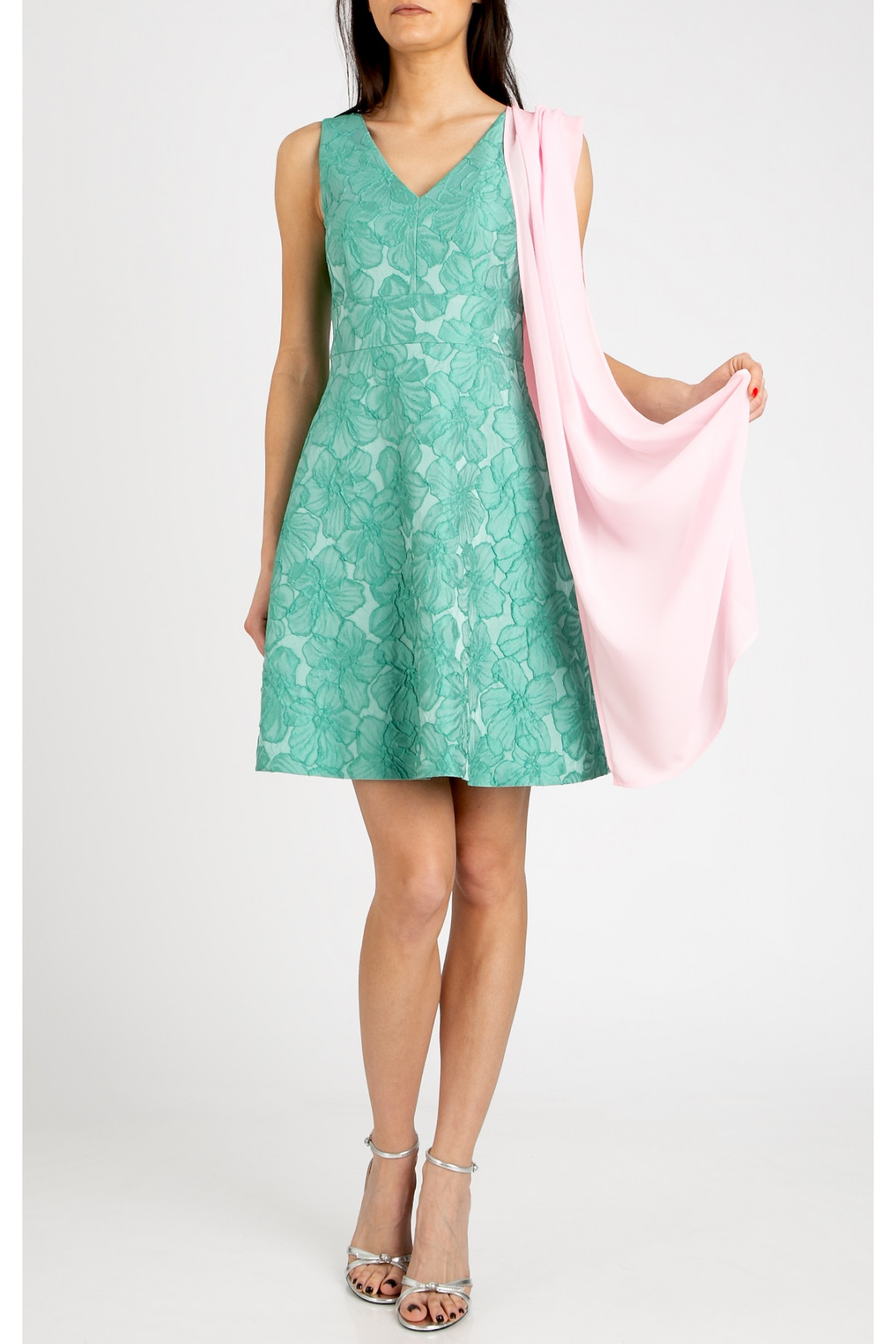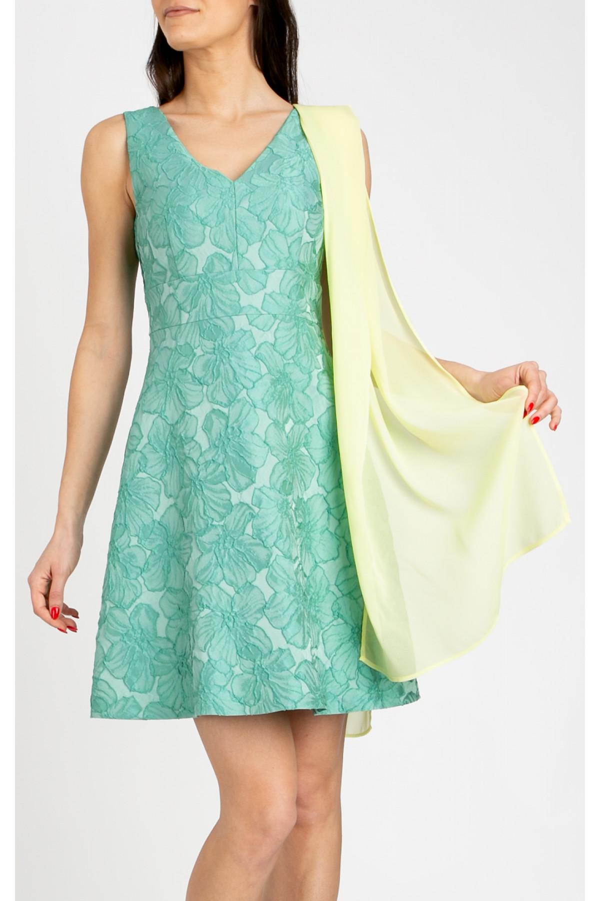 Rochie scurtă de ocazie din jacard satinat de lux în culoarea Sea Green, cu motive florale superbe care conferă profunzime și un relief rafinat țesăturii. Decolteul în V alungește vizual gâtul și oferă un plus de feminitate și eleganță. Talia înaltă este frumos definită printr-o curea lată integrată, care conturează silueta rochiei. Partea inferioară este croită în cloș, fiind potrivită pentru diverse tipuri de siluetă. Finisată cu o căptușeală antistatică și ușor elastică pentru confort și o potrivire impecabilă, această rochie este creată pentru ocazii oficiale, cocktail-uri și evenimente speciale unde nu veți trece neobservată.