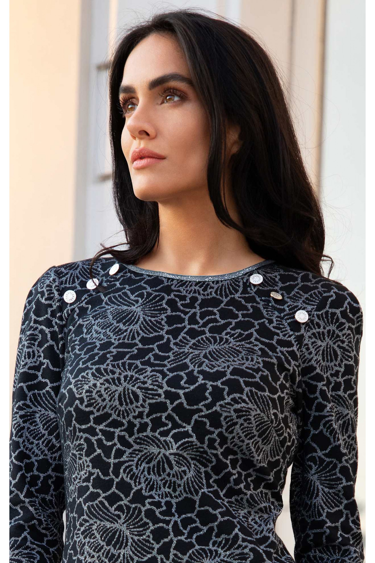 Elegantă și stilată, realizată din jacquard tricotat luxos, în negru, cu frumoase motive florale și fire argintii. Croiul ușor cambrat urmează delicat linia corpului, oferind o senzație de lux și confort pe tot parcursul zilei. Mâneicile au pliuri și ușor volum la nivelul umerilor, cu lungime 3/4, făcând rochia potrivită pentru mai multe sezoane. Butoanele decorative metalice de pe umăr adaugă un accent modern și elegant. Alegerea perfectă pentru seri speciale, întâlniri de afaceri sau momentele în care doriți să adăugați stil și strălucire în ținutele de zi cu zi.