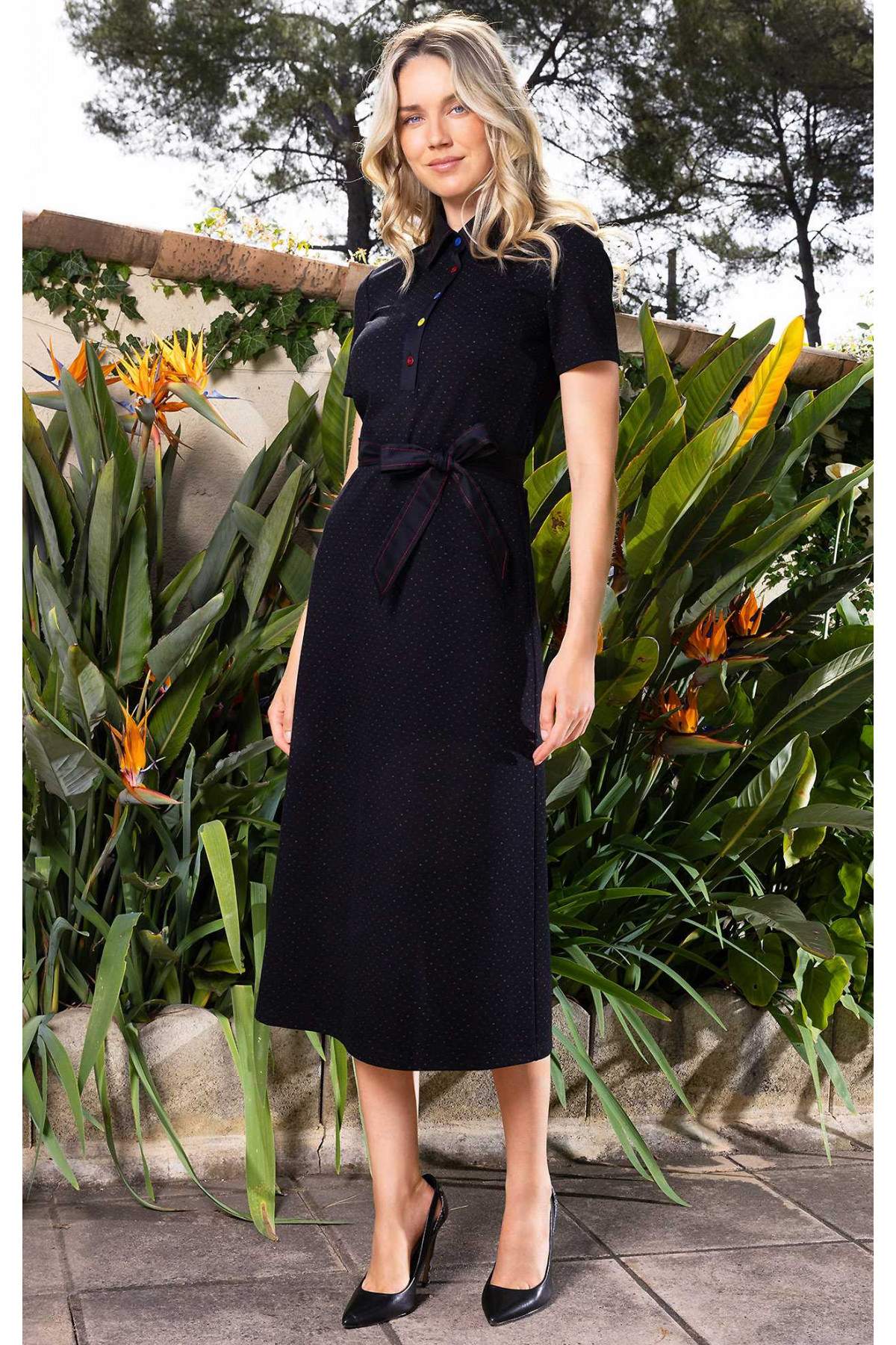 Rochie midi dintr-un material tricotat de lux cu buline colorate delicate. Modelul rochiei are lungime midi, mânecă scurtă, guler clasic din bumbac și curea cu tiv roșu decorativ, cu nasturi colorați. Rochia este potrivită atât pentru buriu sau întâlnire de afaceri, cât și pentru ieșiri zilnice. Rochia este disponibilă în mărimile de la 38 până la 44.
