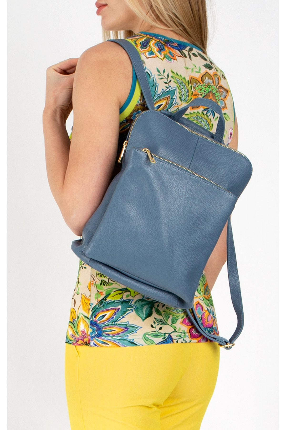 Rucsac comod din piele naturală, de culoare Blue Heaven. Modelul rucsacului poate fi purtat în trei moduri diferite - ca o geantă de umăr clasică, geantă de umăr sport-elegantă sau rucsac. Compartimentul principal are buzunar pentru telefon și accesorii și un buzunar mici cu fermoar. Pentru un confort mai mare este prevăzut un buzunar mare exterior pe partea din față și un mic buzunar pe spate, care se închide cu fermoar metalic.
