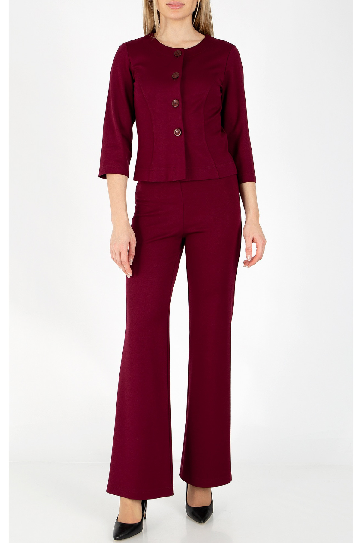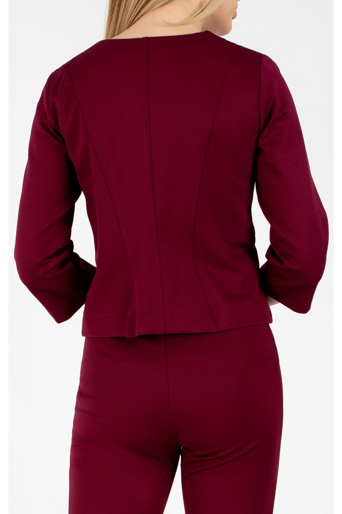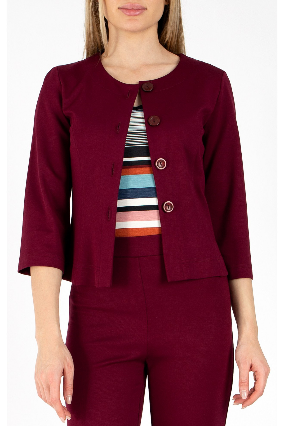Sacou scurt dintr-un material de tricot ajustat de culoare Red Plum. Modelul sacoului are 3mânecă 3/4, decolteu rotund și închidere cu nasturi. Fără căptușeală. Acest model este potrivit pentru a completa aspectul dvs. office sau pentru serile răcoroase în oraș.