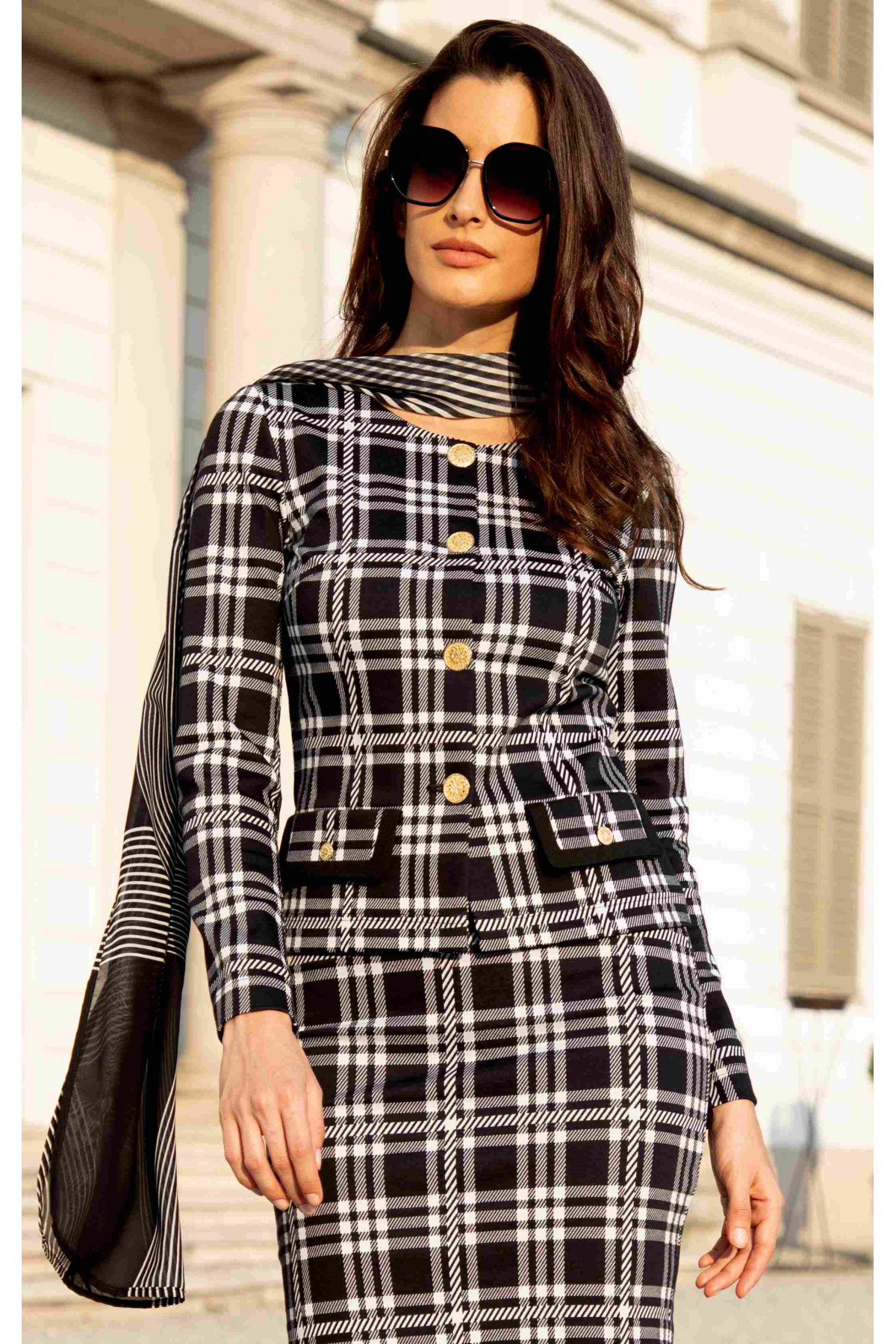 Sacou elegant realizat din jacard tricotat luxos, în clasicul model alb-negru în carouri. Modelul este cambrat, cu mânecă lungă și decolteu rotund, fără căptușeală pentru un plus de confort și întreținere ușoară. Confecționat din jacard tricotat elastic, este accentuat cu nasturi aurii pentru un detaliu stilat și clapete decorative. Extrem de potrivit atât pentru birou, cât și pentru o ținută elegantă de zi cu zi. Se poate combina cu fustă sau rochie în același model.