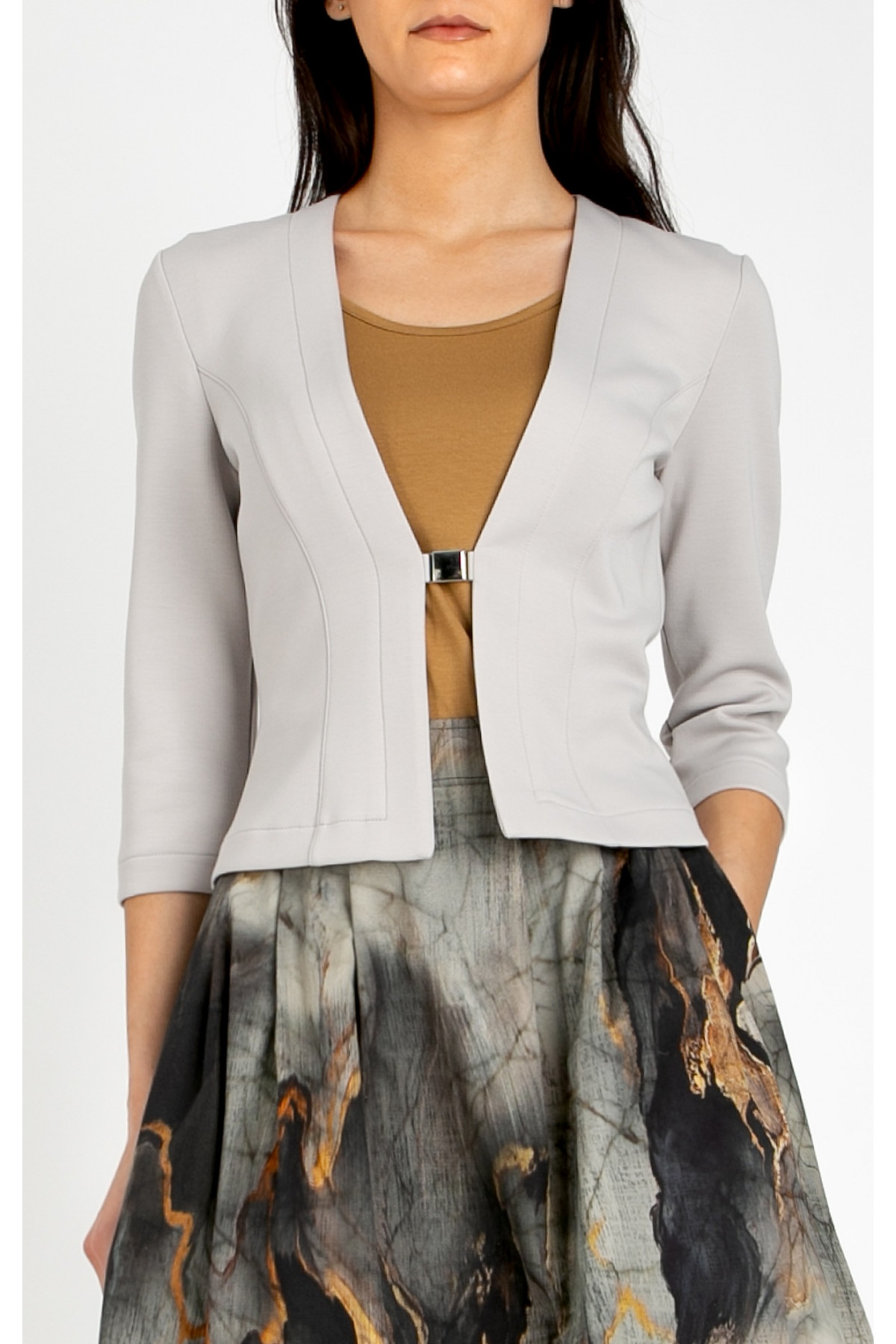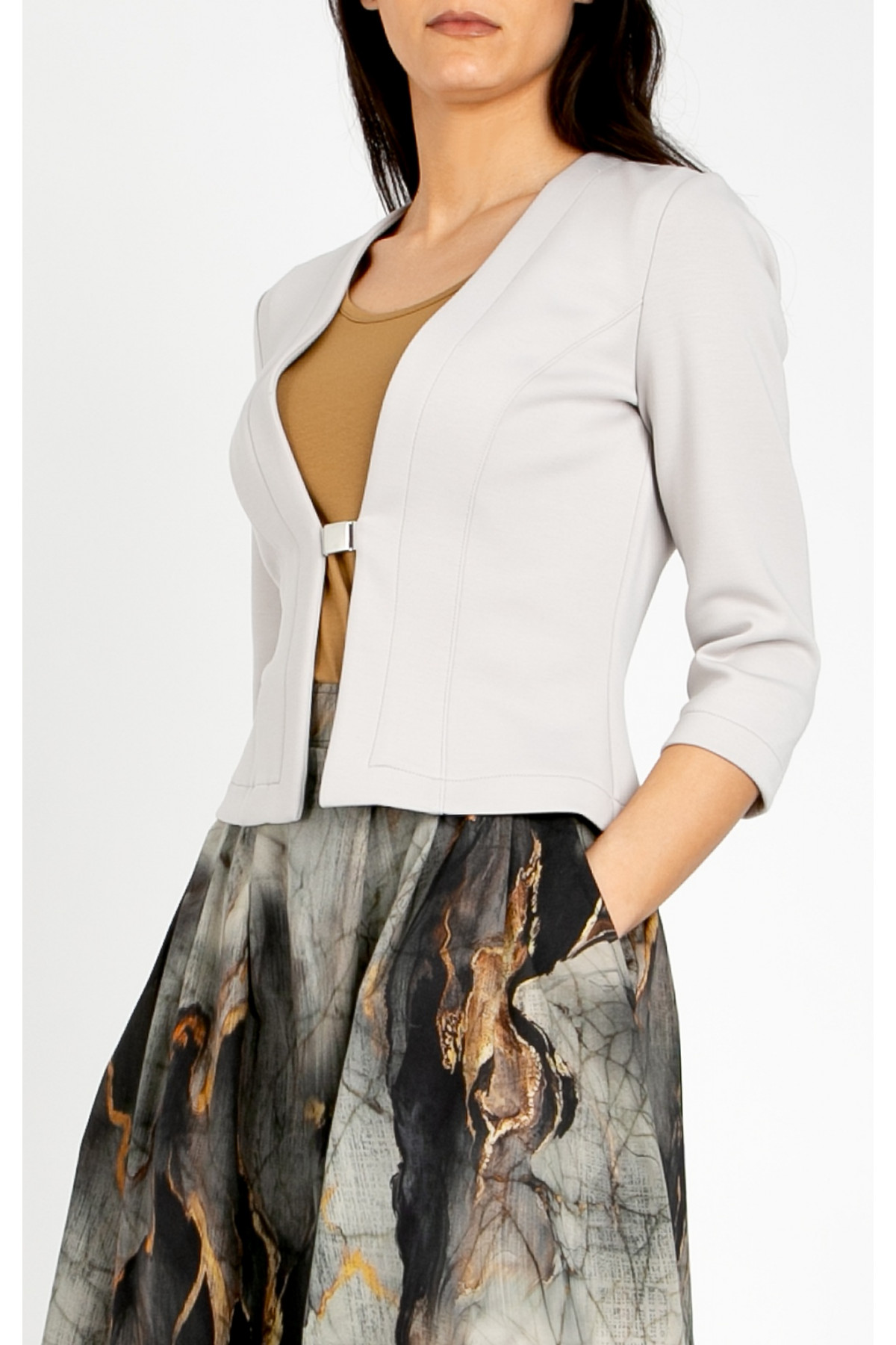 Sacou stilat, realizat din tricot dens de înaltă calitate, într-o nuanță elegantă de gri perlat. Modelul are mânecă 3/4 și închidere fină cu nasture metalic, care îi conferă un aspect modern și bine definit. Acest sacou este completarea perfectă a unei garderobe contemporane, combinând confortul tricotului cu eleganța clasică. Croiala precisă evidențiază silueta, oferind în același timp confort pe tot parcursul zilei. Se asortează perfect cu fuste, pantaloni sau rochii elegante.