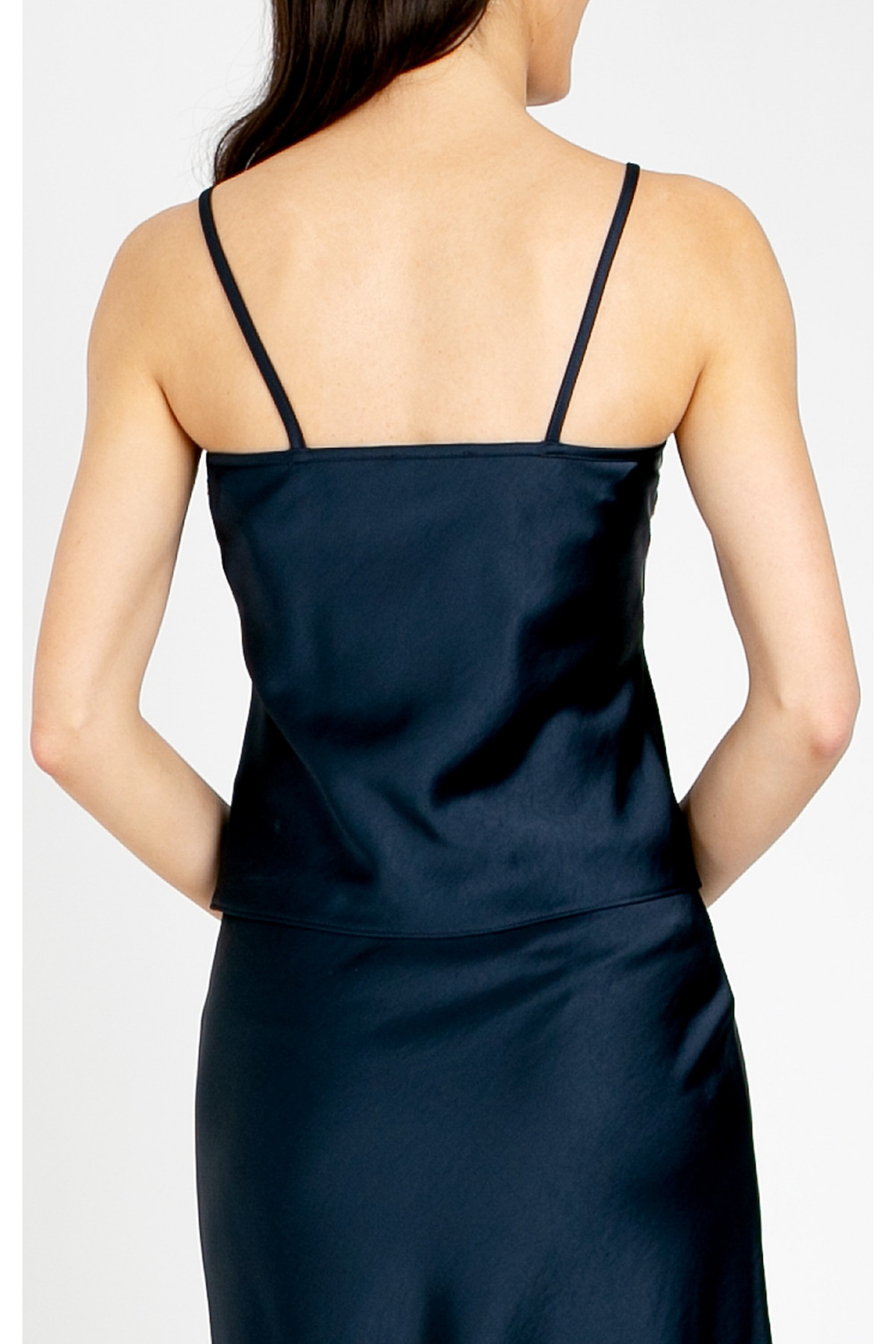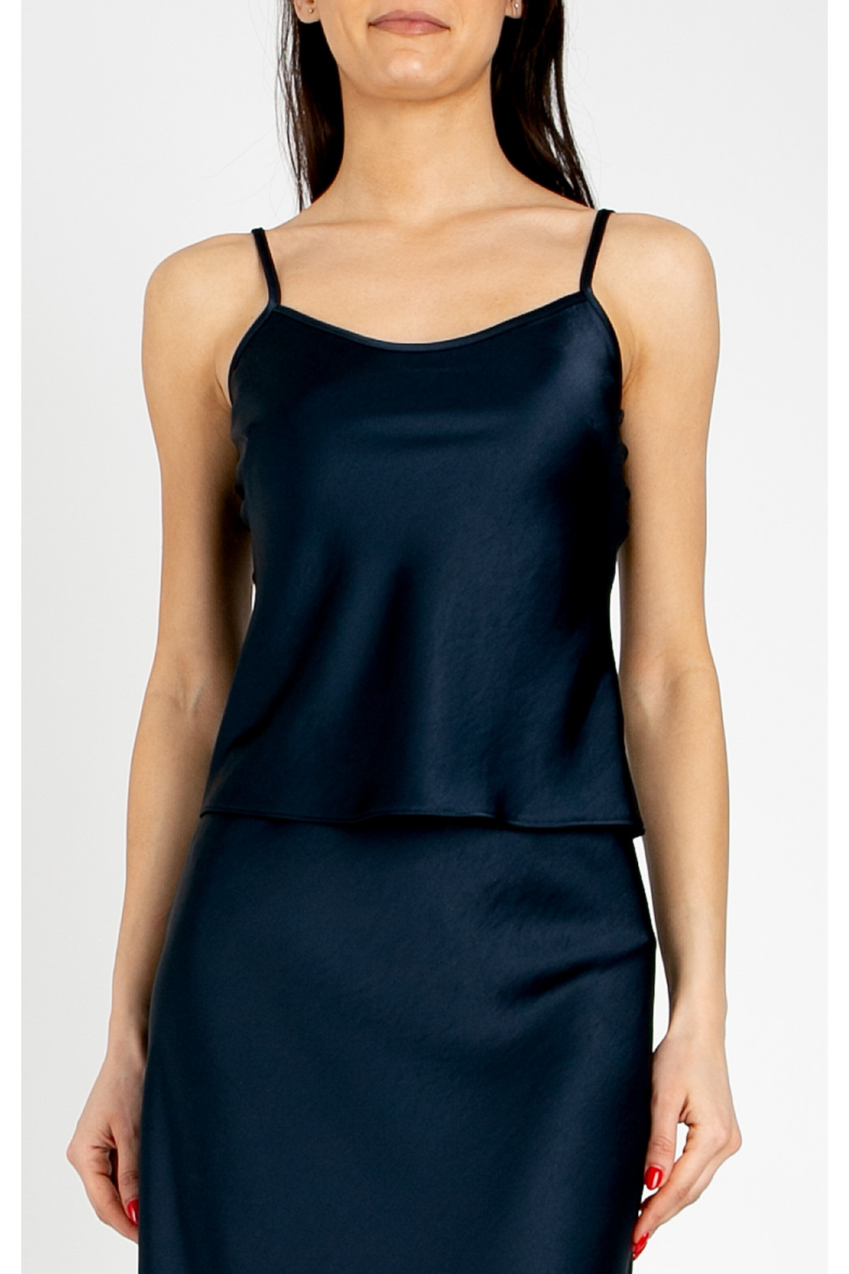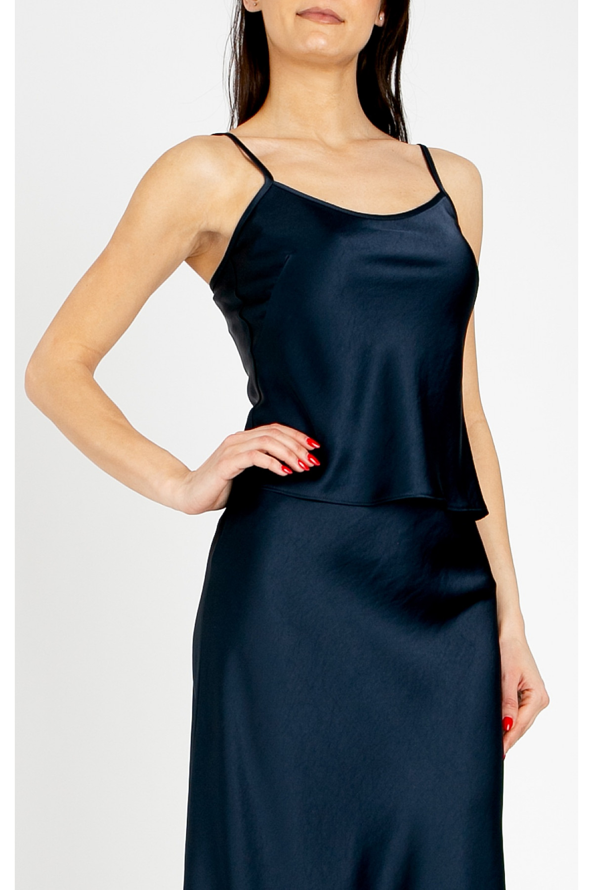Top elegant din satin, cu bretele subțiri, în culoarea Evening Blue. Materialul cu cădere fluidă oferă o senzație plăcută la purtare, iar luciul delicat al satinului evidențiază frumusețea siluetei. Linia fină a decolteului și bretelele delicate pun în valoare gâtul și umerii. Potrivit pentru orice eveniment formal, petrecere sau ocazie cocktail. Asortați-l cu o fustă din același material și în aceeași culoare sau cu pantaloni.